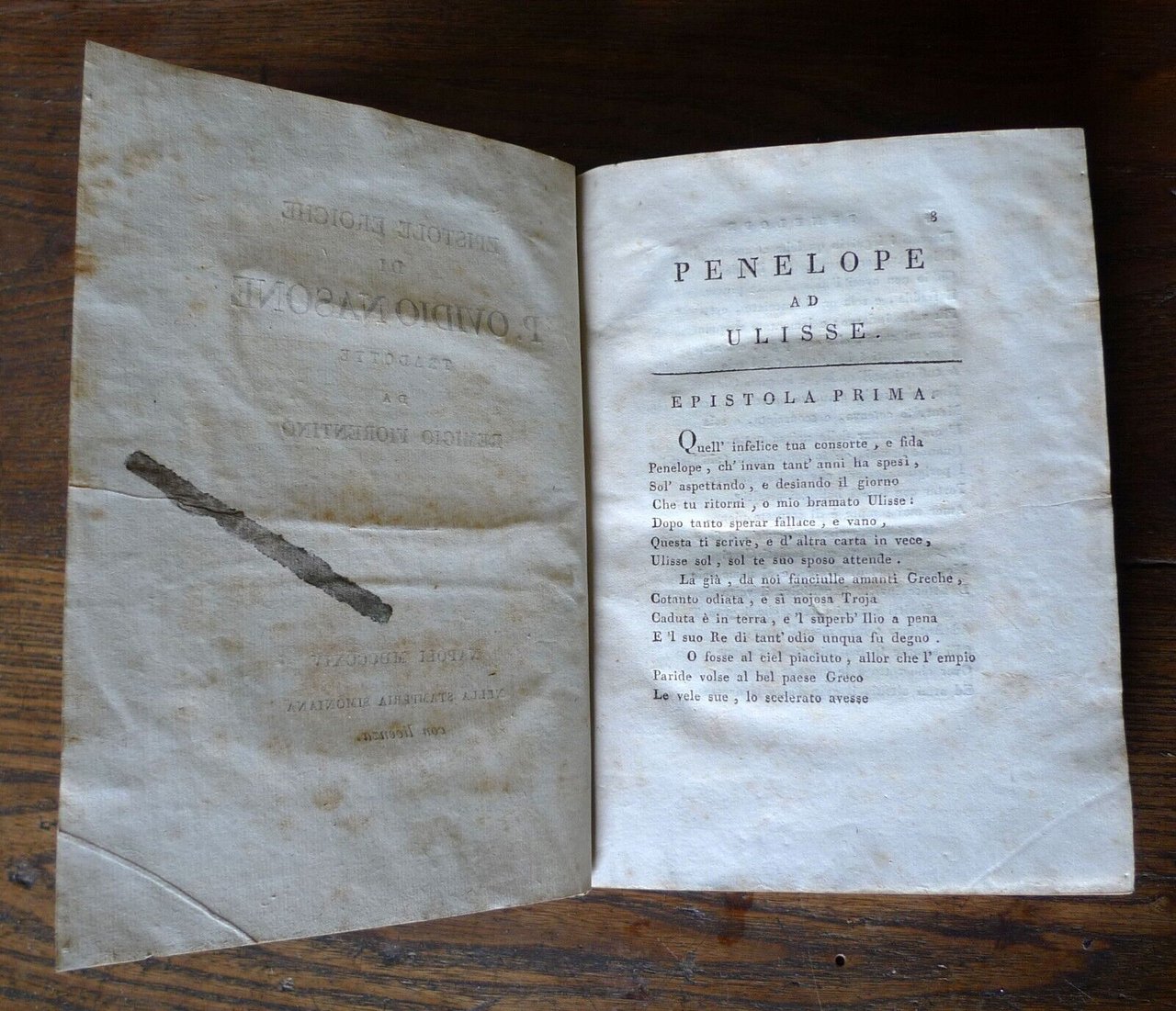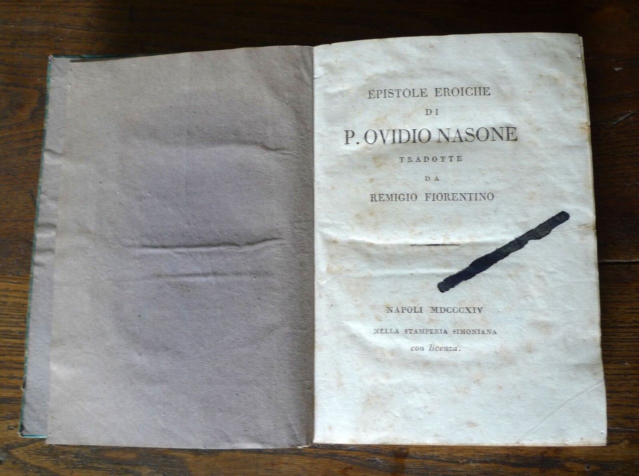 EPISTOLE EROICHE DI P. OVIDIO NASONETRADOTTE DA REMIGIO FIORENTINO.NAPOLI, MDCCCXIV (1814)NELLA STAMPERIA SIMONIANA,copertina rigida, rilegatura coeva in mezza tela,18x13 cm., pp.354,peso: g.400