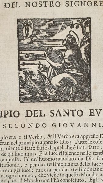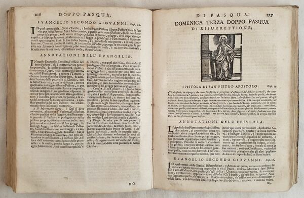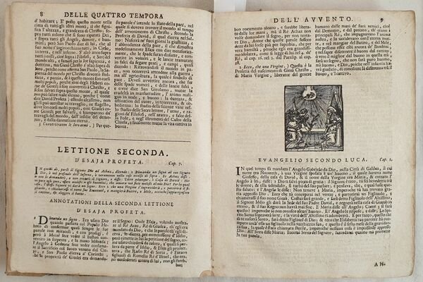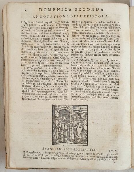 Bella edizione Remondini del 1736 di questo testo religioso sulle lettere e Vangeli scritto da Remigio Fiorentino pseudonimo di Remigio Nannini.<BR><BR>L'opera, un'antologia di letture volgari del Nuovo Testamento arricchita di commenti, venne pubblicata per la prima volta nel 1567 e conobbe molte edizioni poichè di divulgazione popolare sotto controllo ecclesiastico.<BR><BR>Il testo è impreziosito da 76 piccole xilografie nel testo. <BR><BR>Insieme al volume un foglio manoscritto datato 1863, la lista delle messe ordinate da Ottaviani del Castello di Borghetto di Civita Castellana e dal Castello di Cripriaro di Camerino<BR><BR> <BR><BR>In buone condizioni. <BR>Copertina in mezza pergamena in buone condizioni con usure e parti mancanti ai margini e dorso. Legatura in buone condizioni. All'interno le pagine si presentano in buone condizioni con fioriture. Angolo inferiore destro di pag. 163 strappato. In 8. Dim. 23x17 cm. Pp. (20)+479. Beautiful Remondini edition of 1736 of this religious text about letters and Gospel written by Remigio Fiorentino pseudonymous of Remigio Nannini.<BR><BR>the work, an anthology of reading from the New Testament is enriched with comments. Published for the first time in 1567ewas published different times because of popular spread under church control.<BR><BR>Together with the volume and handwritten page of 1863 with a list of masses ordinated by one Lord from the Castle of Borghetto in Civita Castellana and Castle of Cripriaro in Camerino.<BR><BR>The text is enriched with 76 little woodcut in the text. <BR><BR> <BR><BR>In good conditions. <BR>Half parchment cover in good conditons with wearings and missing parts in the edges and spine. Binding in good conditions. Inside pages are in good conditions with foxings. Right lower corner of page 163 is teared. In 8. Dim. 23x17 cm. Pp. (20)+479.