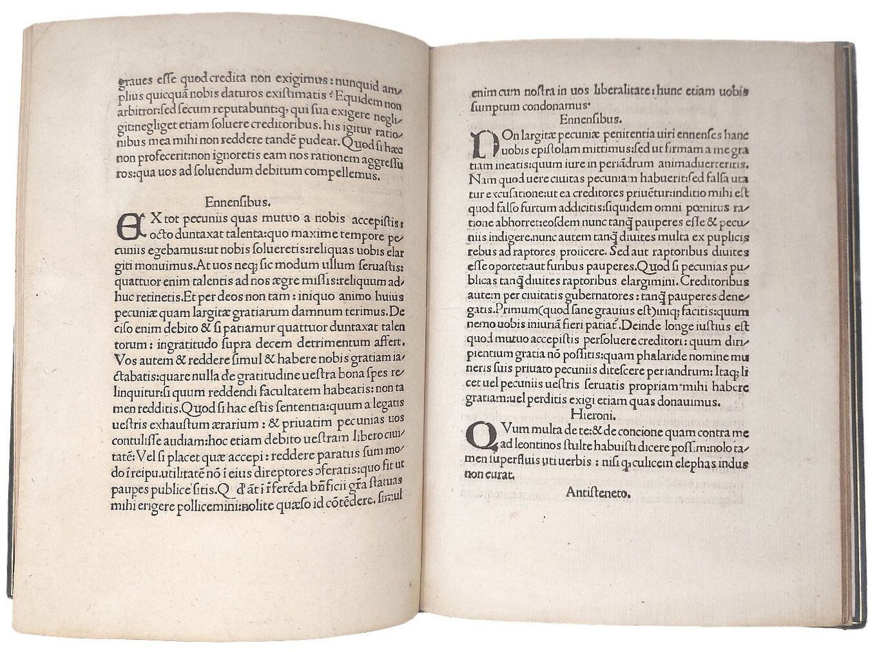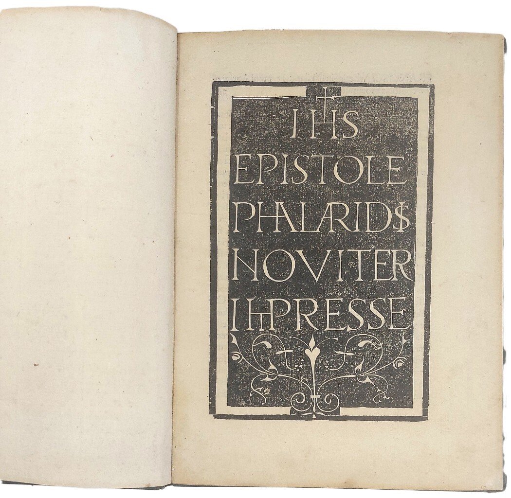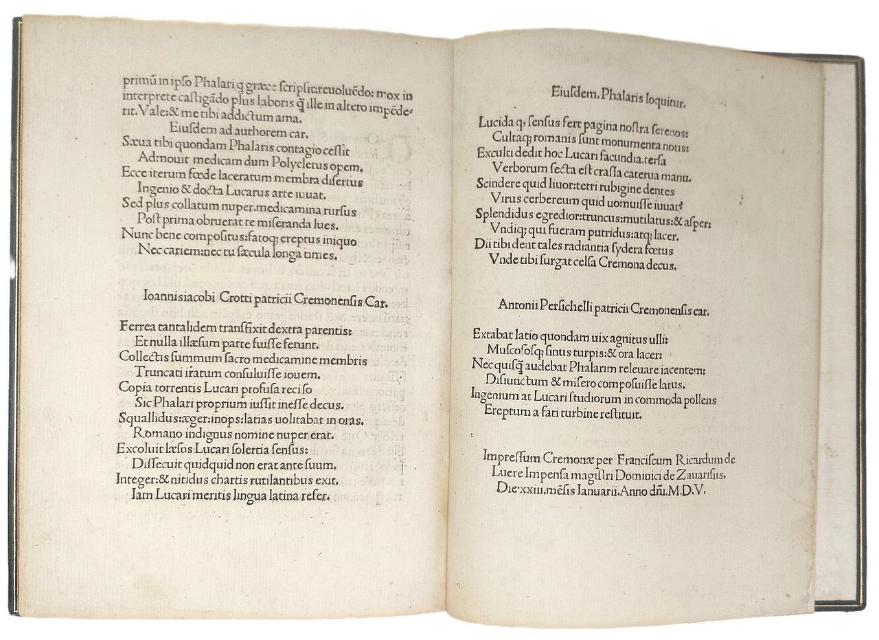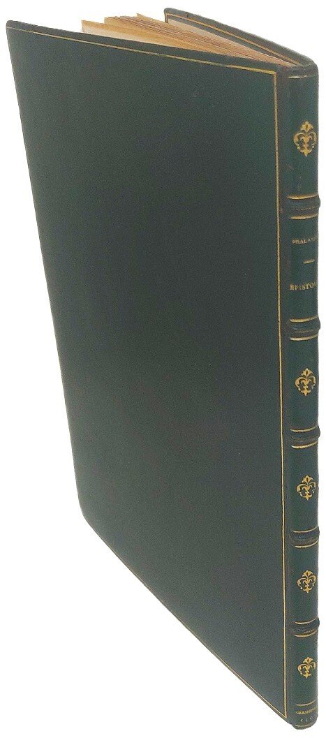 >in-4, ff. 44 n.n. (segn. A4 B-F8), elegante leg. 800esca in marocchino verde, titolo e fregi in oro al dorso a nervetti, tagli dorati. Frontespizio xilografico su fondo nero, una grande iniziale ornata, car. tondo. Precedono il testo l'importante proemio di Francesco Griffolini ''Aretinus'' a Novello Malatesta, signore di Cesena, nel quale afferma la maggiore veridicità storica del genere epistolare rispetto alle cronache; e la dedica del cremonese Niccolò Lugaro (1447-1515) a Corrado Stanga. L'editore Zavarisio utilizzava abitualmente la tipografia di Francesco Riccardi. Queste lettere, erroneamente attribuite a Falaride (VI secolo a.C., tiranno di Acragas), si devono probabilmente ad Apollonio di Tyana e Marco Bruto (I secolo a.C.). La traduzione si deve al Griffolini (1420-1490 c.) ''la più importante impresa versoria del G., per la quale egli conseguì grande fama in età umanistica grazie anche alla cospicua fortuna del testo, poi volgarizzato da Bartolomeo Fonzio'' (D.B.It vol. 59, p.383). Pur essendo rarissime la maggior parte delle numerose edizioni quattrocentesche, l'importanza di questa elegantissima edizione va ricercata nel legno che funge da frontespizio, tra i più raffinati del primo Cinquecento italiano: in grandi capitali intagliate su fondo nero, in alto il monogramma di Cristo, in basso un lieve fregio floreale. Le lettere sono state in alcuni casi accorpate per ottenere la stessa giustificazione delle 4 parole pur mantenendo le stesse proporzioni. Perfetto esemplare marginoso e fresco, di libro rarissimo (4 esemplari censiti da SBN). Barbieri, Il frontespizio nel libro italiano, tav. CXXXII, p. 108 e 139: ''Anche i pochi titoli intagliati su un fondo nero variamente sagomato, per il disegno delle lettere e la composizione, oltre che per la sagoma stessa, esprimono il gusto, lo stile del silografo''. Sander 5649. Non in Bologna. BMC p. 509. Non in Adams.