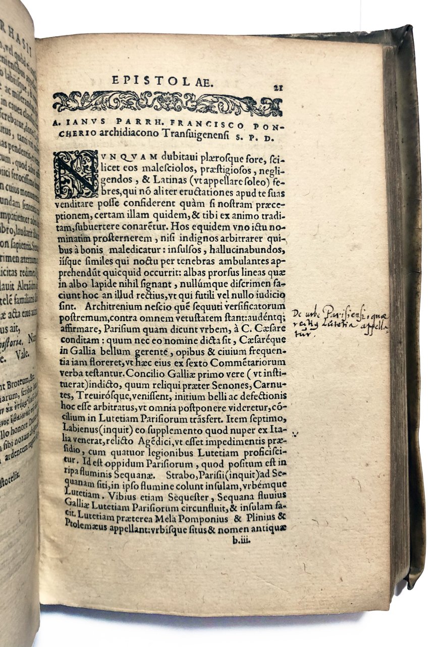 FIRST EDITION of this collection of letters (mostly fictitious) with critical comments on a great number of passages from Titus Livius and other classical Greek and Latin authors. The work is divided into five books, containing respectively 22, 26, 24, 28 and 26 letters. It was reprinted in 1585. The work is dedicated to Joannes Scheyf, chancellor of Braband (Leuven, August 18, 1576).
