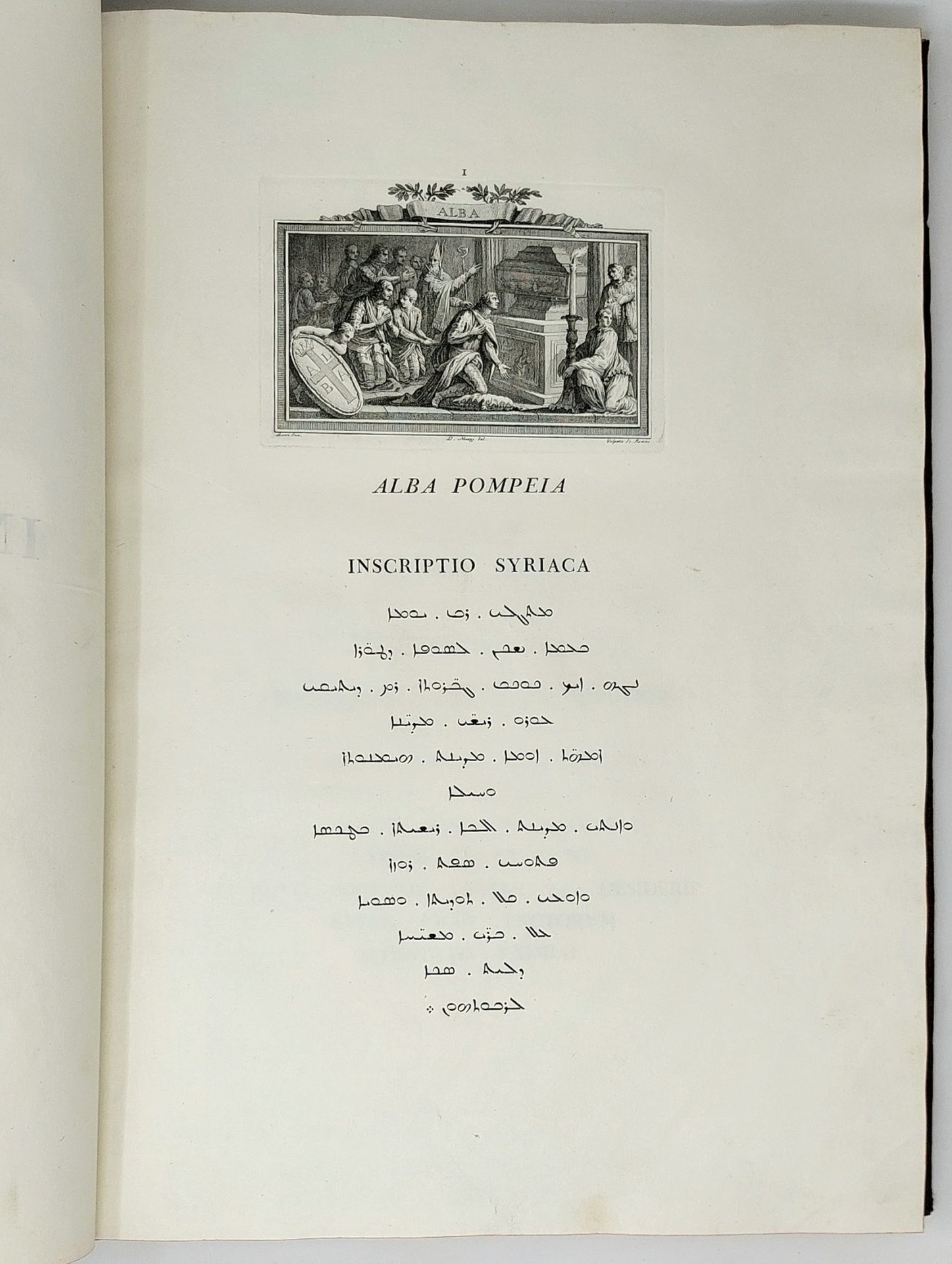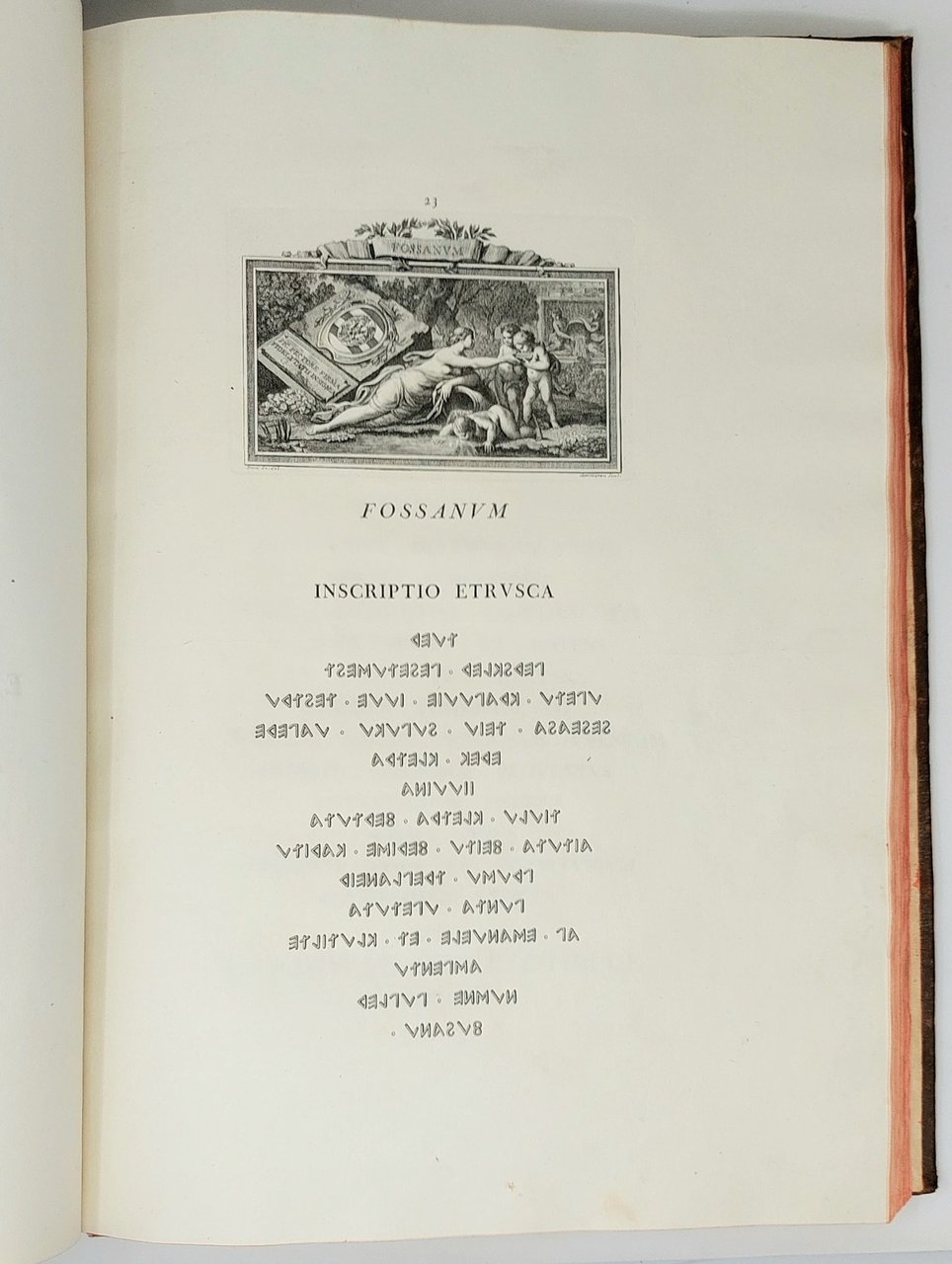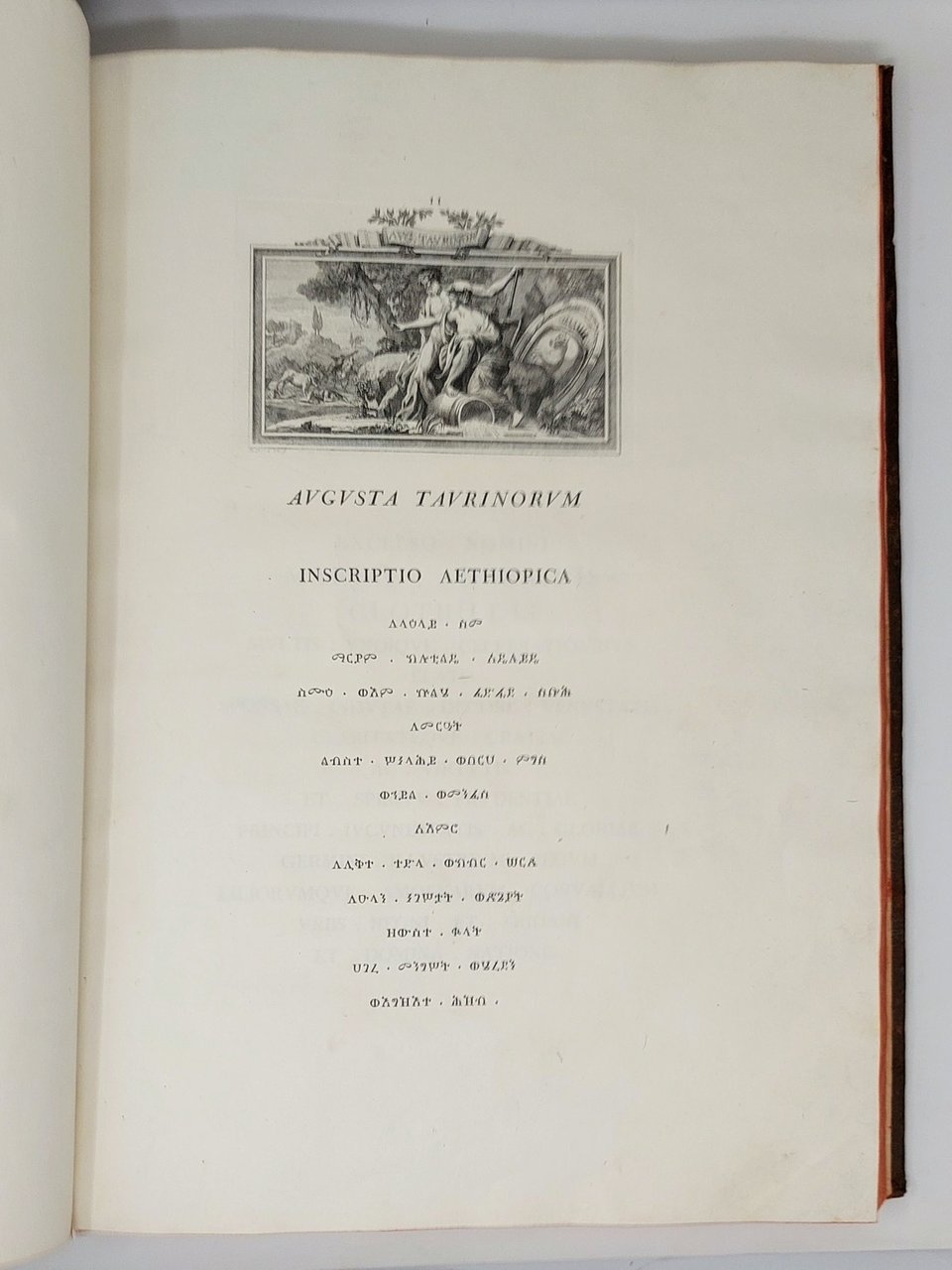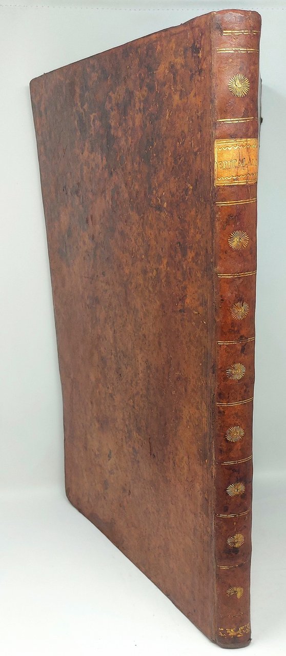 >In-folio (479 x 325 mm); 6 ff. (compreso il frontespizio), XLII pp. + occhietto, 76 ff. numerati per le iscrizioni più uno non numerato con l'"Elenchus", pp. (4 con occhietto e dedica), XXXV, (1) per il poemetto del Conte Castone della Torre di Rezzonico . Legatura coeva in pelle, tassello granata con titolo e fregi oro al dorso. Uno dei primi veri e propri manuali di caratteri di Bodoni, un vero capolavoro per la fusione tra la parte tipografica e quella iconografica: le 139 incisioni in rame che adornano il nostro esemplare sono opera dei maggiori artisti del tempo: Benigno Bossi, Giovanni Volpato, Domenico Cagnoni, Simon Francois Ravenet ed altri. Il volume venne realizzato espressamente per le nozze di Maria Clotilde con Carlo Emanuele di Savoia. I fogli della seconda parte num. 1-50 comprendono 25 iscrizioni in lingue esotiche in lode degli sposi, ad opera del noto orientalista G.B. De Rossi, i cui caratteri esotici costituiscono “la prima completa prova tipografica nella storia dei caratteri orientali di produzione europea” (Giani, Saggio, pp. 3-5). Ogni iscrizione è sovrastata dall'allegoria incisa della città piemontese a cui è dedicata, seguita da un foglio che comprende la versione latina ed i ritratti dei vari sovrani sabaudi nella parte superiore. Al f. 51 Voto di fedeltà di tutte le città a Vittorio Amedeo II con suo ritratto in alto; al f. 52 occhietto del capitolo (ff. 53-76) dedicato alle spiegazioni delle incisioni allegoriche, con cenni storico-geografici sulla città cui si riferiscono. Nelle pp. 41-43 del “Saggio” di Giani, è presente una breve, quanto utilissima spiegazione in italiano di questi testi, ad esempio: “Augusta Taurinorum - Traendo l'etimologia del nome di Torino dal racconto favoloso di un toro inferocito ed ucciso dagli abitanti del luogo che si denominarono così Taurini, l'autore dell'incisione rappresenta nelle due figure simboliche del Po e della Dora che assistono alla lotta mortale, le due città piemontesi (Bossi del. ed inc.)”. Uno dei capolavori dell'arte tipografica bodoniana, si conoscono tre differenti stati della presente opera e il presente corrisponde alla variante B descitta da Brooks. Buon esemplare.