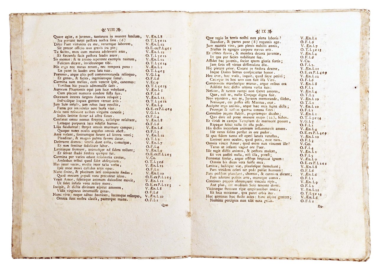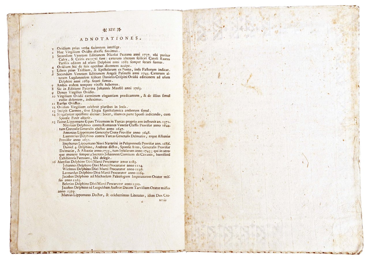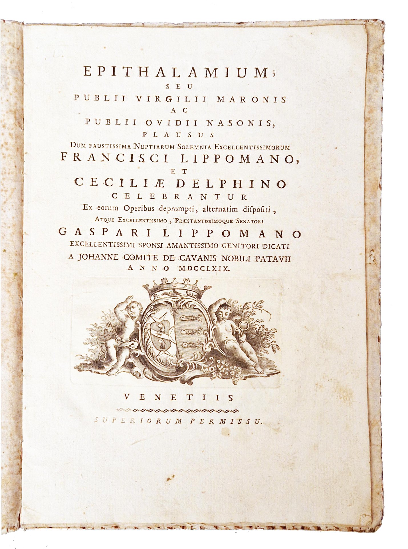 in-4°, 280x194 mm, legatura in carta decorata a mano; pp. [III]-XVI (quest'esemplare è privo della seconda (pp. III e IV) e dell'ultima carta (pp. XV e XVI). Grande vignetta calcografica al frontespizio, con lo stemma alle armi del dedicatario, il conte Giovanni Cavanis, uno degli esponenti di maggior rilievo della nobile famiglia Cavanis, padre dei fondatori della Congregazione delle Scuole di Carità di Venezia, il quale entrò nella Cancelleria ducale nel 1769 e ricoprì importanti incarichi di responsabilità. Edizione originale di questo poema nuziale, scritto per le nozze di Francesco Lippomano con Cecilia Dolfin, riportante alcuni versi di Virgilio e di Ovidio. Rif.: Non censito in ICCU. OCLC, 899269310 (una copia in USA a University of Illinois at Urbana Champaign). Cond.: Lievi tracce d'uso alla legatura. Carte pulite. Esemplare molto raro, purtroppo incompleto (mancano due carte), ma in buone condizioni generali.