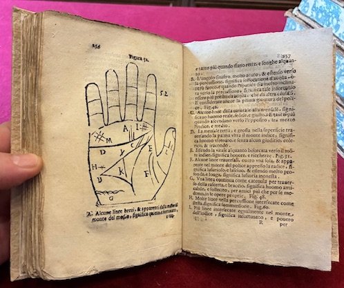 8vo (cm. 17), 344 pp. Con 78 figure a piena pagina n.t. raffiguranti mani chiromantiche. Grande vignetta xilografica al frontespizio (e altra al verso). Marca editoriale al colophon (Toro passante sormontato da tre spighe. In cornice formata da corona di foglie con nastro intrecciato). Legatura recente in cartonato rustico. Scritta di antica mano sulla carta di guardia libera anteriore. Minime sporadiche arrossature, peraltro ottimo esemplare in barbe. Rara edizione di questa bella opera di chiromanzia, stampata per la prima volta nel 1522 con un corredo di sole 49 figure. Questa nostra edizione è illustrata di una bella vignetta al recto del frontespizio che rappresenta il frate negromante mantovano Patrizio Tricasso nel suo studiolo, mentre al verso riprende il legno che ornava il frontespizio della prima edizione, inoltre vi sono 78 figure di mani incise in legno nel testo. Cfr. Caillet, 10830;‘Bibliotheca Magica Casanatense, 1183; Bibliotheca Esoterica, 4943.