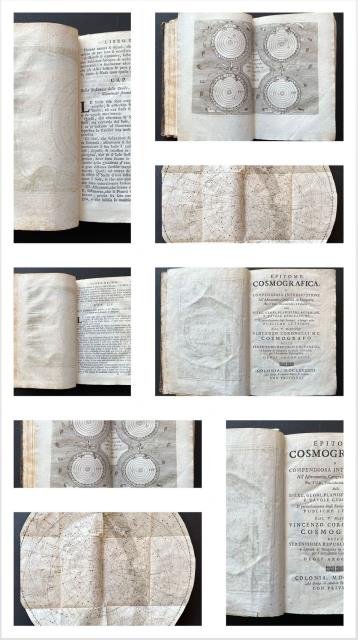 Colonia (ma Venezia), MDCLXXXXIII (1693), ad istanza di Andrea Poletti, in Venetia. Volume in 8vo, antiporta incisa (da taluni considerata la tavola 1 ma che noi contiamo a parte) con titolo entro medaglione cinto di lauro, ancorato a una catena ed emergente dall'acqua sorretto da un putto (o genietto) marino; un altro genietto, cinto di lauro, sorregge l'impresa degli Argonauti con motto “Plus Ultra”; ricco front. testuale, segnatura A – Cc4, pp. (26) n. n., 420 (con Indice) + (16) n. n. di cui 8 con il lungo discorso di Carlo Malavista “Dell’eccellenza, invenzione e progresso dell’astronomia”. Con 35 tavv. ripiegate in b/n f. t. e finemente incise (su 36 complessive se si considera anche l’antiporta incisa). Tra le pagina 192 /193 il sottile inserto di carta è la brachetta di rilegatura, vale a dire che tra queste due pagine non manca nessuna tavola (come verificato da altro esemplare). Il nostro esemplare è mancante della tavola del “Planisfero del Continente Vecchio”; la tavola è di fatto presente perché da noi ricercata e inserita, proveniente da altro esemplare (tavola in recente coloritura e che consideriamo nella nostra numerazione come la tavola 20, inserendola fra le pagine 256 / 257, subito prima della tavola del “Continente Nuovo” che si trova tra le pagine 264 / 265). Questa tavola sembra peraltro mancare ab origine non essendo presente alcun segno di asportazione. Precisiamo inoltre che da un confronto con altri esemplari (da confronto con vecchi cataloghi o con altri esemplari presenti in rete e digitalizzati), le più importanti tavole sono spesso mancanti, nonché, le minori, suscettibili di slittamenti all’interno del volume. Infine abbiamo considerato che le schede bibliografiche che riportano 38 tavole (anziché 36 con l’antiporta o 35 senza l’antiporta) fanno evidentemente riferimento alle due tabelle a inizio volume, appellate per l'appunto “Tavola Prima” (pp. 6/7) e “Tavole Seconda” (pp. 8/9) ma traendo in inganno sul numero effettivo delle tavole presenti. Legatura originale in piena pelle con dorso a cinque nervi, fregi e titoli oro. Vincenzo Maria Coronelli (Venezia, 1650 – Venezia, 1718) fu geografo e cosmografo della Serenissima Repubblica di Venezia. L’ “Epitome Cosmografica” è l’opera che meglio rappresenta la sintesi teorica e pratica di quel vastissimo e importante lavoro di cartografo che il Coronelli svolgerà in tutto il corso della sua vita. Il Coronelli produsse quasi quattrocento carte cosmografiche e geografiche: l’ “Atlante veneto” (1690) il “Corso Geografico” (1694), l’ “Isolario” (1696), l” “Arcipelago” e la “Biblioteca universale sacroprofana” (1701 - 1709), un’enciclopedia alfabetica prevista in venti volumi dei quali furono prodotti solo i primi sette. E produsse anche decine di globi terrestri e celesti, tra i più prestigiosi dell’epoca, a partire da quelli enormi del 1693, dedicati a Luigi XIV, ai più piccoli del 1696, e dedicati a Guglielmo III d’Orange, re di Inghilterra. L’”Epitome Cosmografica”, dedicata all’Accademia degli Argonauti, la prima società geografica del mondo, fondata dallo stesso Coronelli, è suddivisa in tre libri, nei quali si trattano venti, climi, terremoti, “stelle nove”, pianeti, comete, costellazioni. Ed è proprio in questa opera che il Coronelli si sofferma a descrivere con minuzia di particolari anche il metodo da lui utilizzato per costruire materialmente i globi, parlando di colle, vernici, tecniche di pittura, incisioni in rame. Rara prima edizione di questo importantissimo trattato di cosmografia e geografia. “Opera non certo originale ma interessatissima perché è il primo tentativo di condensare. quanto finora era stato pubblicato, dai tempi più antichi ai modernissimi, sull’astronomia e la geografia. il nostro cosmografo si trovò a comporre quello che può essere chiamato il prototipo dei moderni manuali di geografia fisica, naturale e politica. (Armao, pp. 189 – 190); “… L’Opera è interessante… tra l’altro per un elenco di terremoti prima e dopo Cristo fino al grande terremoto in Sicilia nel gennaio 1693; per le coordinate astronomiche di 150 città etc.” (Piantanida, cat. n. 1338); “… con un indice di 38 fig. le quali mancano all’esemplare da me posseduto.” (Ricciardi, I, 374 - 75); Roller e Goodman I, 253; Houzeau & L., I, 8006). Pochi esemplari si trovano con le tavole al completo e per lo più mancano quelle con i planisferi. L’opera fu ristampata nel 1713 con alcune varianti. Esemplare con ordinari segni e mancanze agli estremi della legatura dove la pelle del dorso può risultare mancante o usurata, alcuni trascurabili forellini di tarlo al margine inferiore delle prime carte bianche, peraltro pulito, ben conservato e con una buona impressione e conservazione di tutte le tavole. .