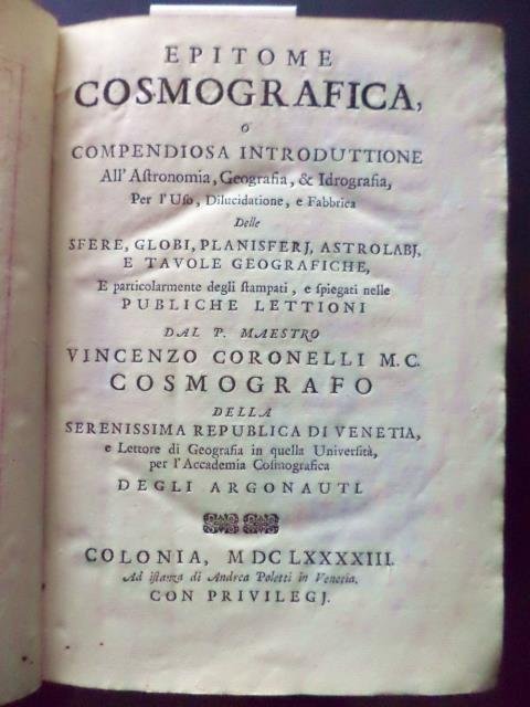 Epitome cosmografica o Compendiosa Introduttione all'Astronomia, Geografia, & Idrografia, per l'Uso, Dilucidatione, e Fabbrica Delle Sfere, Globi, Planisferi, Astrolabj e Tavole Geografiche, E particolarmente degli stampati, e spiegati nelle pubbliche lettioni dal P. Maestro Vincenzo Coronelli M. C. Cosmografo della Serenissima Republica di Venetia, e Lettore di Geografia in quella Università, per l'Accademia Cosmografica degli Argonauti.