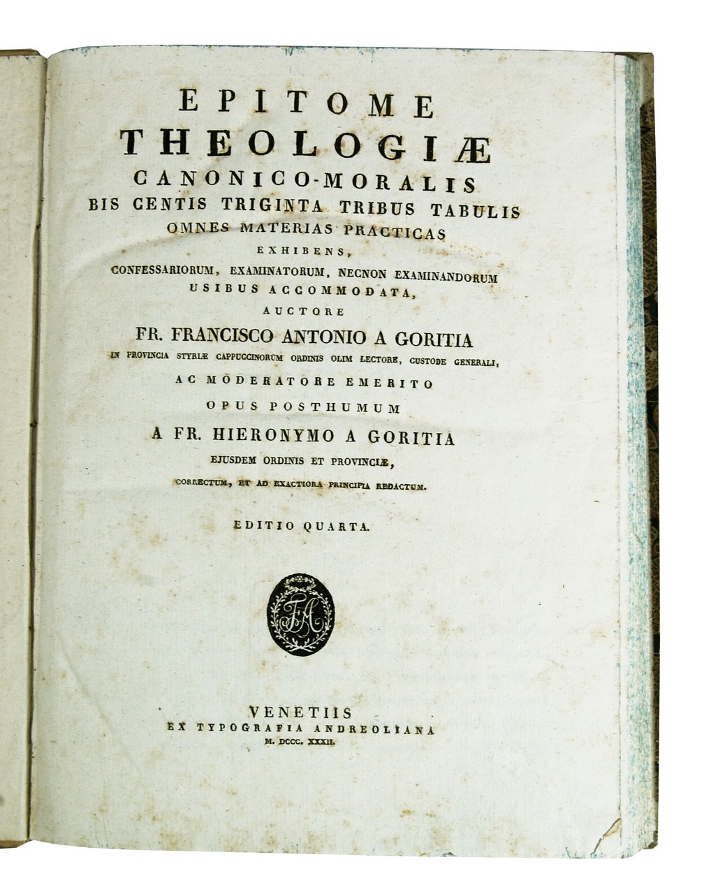 Epitome theologiae canonico-moralis bis centis triginta tribus tabulis omnes materias practicas exhibens, confessariorum, examinatorum, necnon examinandorom usibus accomodata, auctore Francisco Antonio a Goritia in provincia Styriae Cappuccinorum Ordinis olim lectore, custode generali, ac moderatore emerito; opus posthumum a Fr. Hieronymo a Goritia ejusdem ordinis et provinciae, correctum, et ad exactoria principia redactum. Editio quarta.