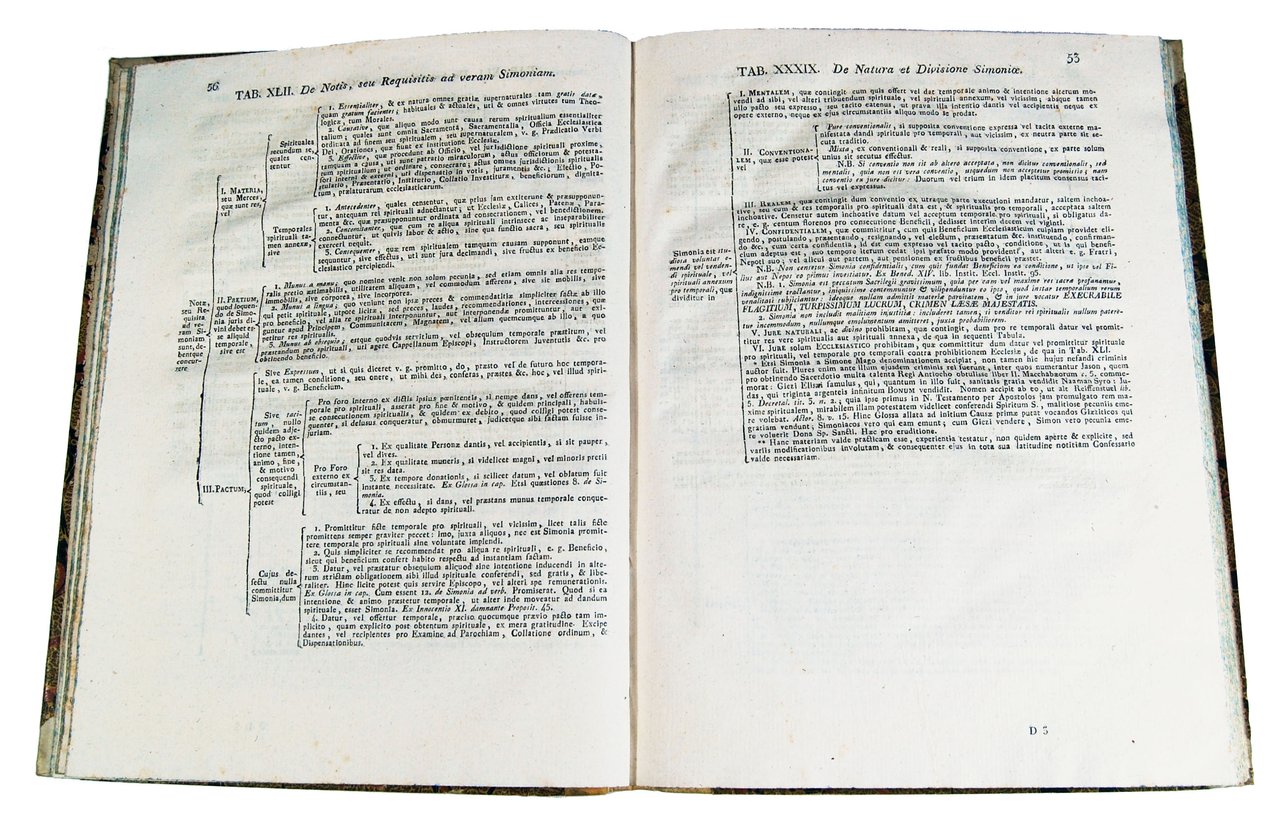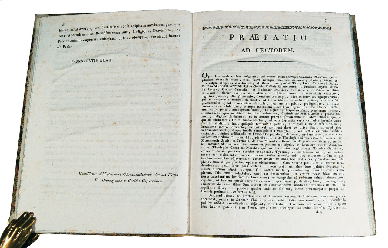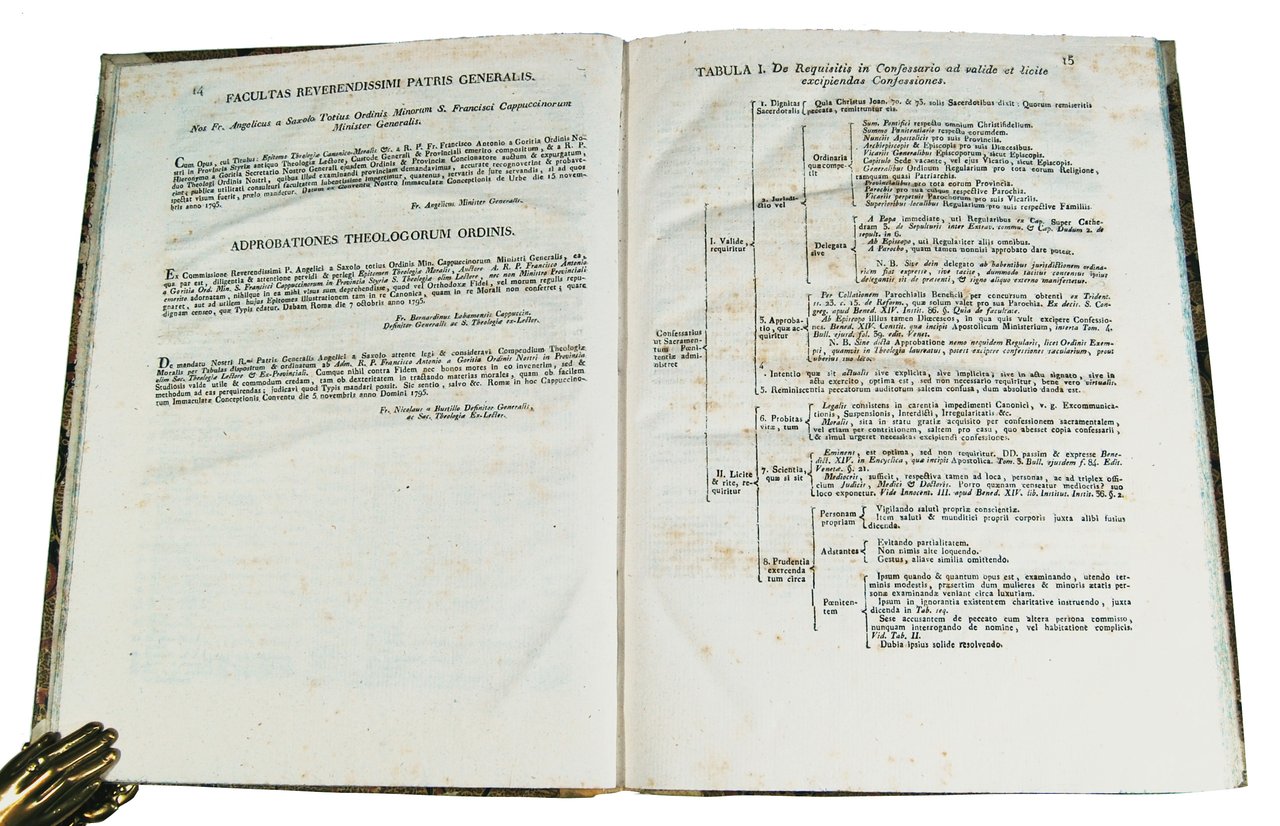 in-8° grande (290x214 mm); leg. coeva in mezza pergamena a dorso liscio con titolo manoscritto al dorso e carta marmorizzata a grosse bolle ai piatti; tagli spruzzati di colore azzurro; pp. 248; marca tipografica al frontespizio (con le iniziali F.A. corrispondenti al tipografo Francesco Andreola). Quarta edizione di questa raccolta sistematica delle regole canonico-morali organizzata su tabelle; testo scritto dal Padre cappuccino Francesco Antonio da Gorizia e poi corretto e pubblicato, postumo, dal Padre cappuccino Geronimo da Gorizia; l'opera comprende la dedica a Papa Pio VI, la prefazione, l'indice delle tavole, le approvazioni, 233 tavole ed un'appendice. Ref.: IT\ICCU\URB\0451016. OCLC, 633788185 (1 copy in Germany), 635610106 (1 copy in Swutzerland) and 237107930 (1 copy in USA in the Saint Bonaventure University, Friedsam Memorial Library, St Bonaventure, NY). Cond.: Lievi tracce d'uso e sporadiche macchie tipiche dell'età della carta stessa. Opera in condizioni generali quasi ottime. -- FOURTH EDITION OF THIS SYSTEMATIC COLLECTION OF CANON & MORAL RULES ON TABLES, WRITTEN BY FATHER FRANCIS ANTHONY FROM GORIZIA. Light traces of use and sporadic spots typical of the age of the paper itself. Copy quite in excellent condition.