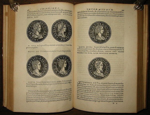 8vo (cm. 18), 36 cc.nn., 335(1) pp.con oltre 400 ill.ni xilografiche n.t. (monete e medaglioni raffiguranti gli Imperatori romani). Marca tipografica al frontespizio. Bella legatura antica in vitellino nocciola con nervi, fregi e titolo impresso in oro al ds. Doppie cornici dorate ai piatti. Ex libris di collezione privata al contropiatto anteriore. Fenditura alla cerniera anteriore, piccola mancanza alla cuffia inferiore e lievi tracce d’usura. Nel complesso, ottimo esemplari con interni assai freschi. Rara seconda edizione latina (la prima, stampata a Lione, è del 1553). Adams S-1917.