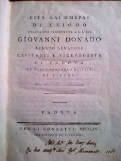 Epta kai hmepai di Esiodo. Traduzione presentata a S.E. Ser Giovanni Donado veneto senatore, capitanio e vice-podestà di Padova [.].