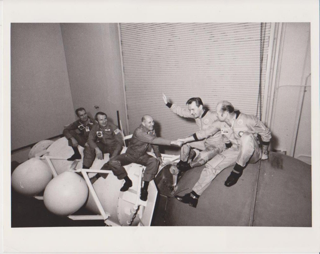 Vintage print, al verso timbro della NASA, testo dattiloscritto in Inglese, etichetta per la catalogazione. La fotografia ritrae alcuni astronauti russi e americani seduti sul modulo che permetterà il passaggio dal modulo Apollo al modulo Soyuz una volta in orbita.