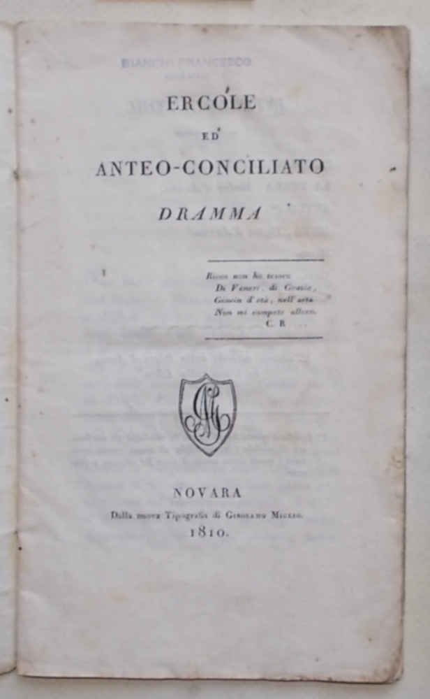 In 8° (cm. 20 x 12); pagg. 21; piccolo stemma con iniziali dello stampatore al frontespizio; brossura muta originale. Timbro e qualche brunitura, ma molto buono. VG-. ** Manca alla "Bibliografia novarese". In versi. L'azione avviene nella Regia d'Anteo in Irasa nella Libia.