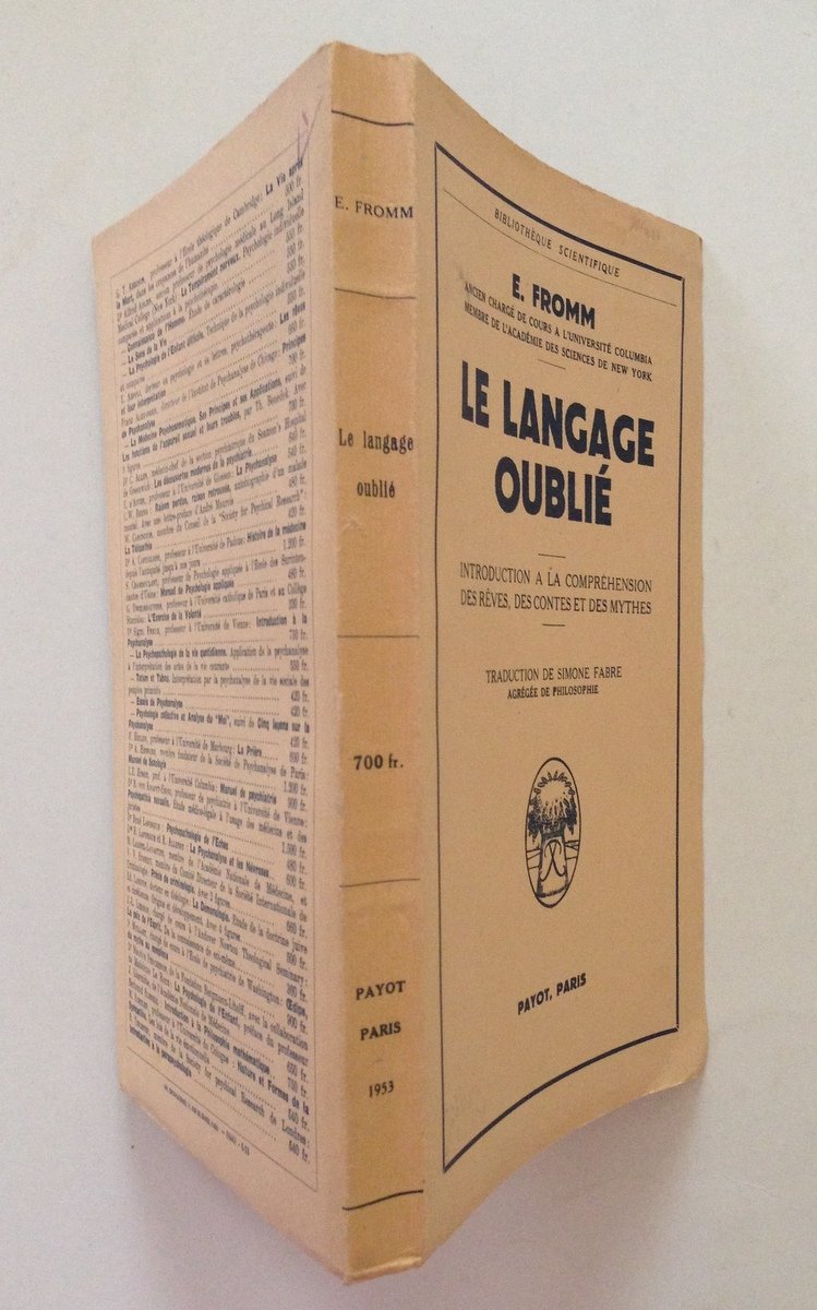 Erich Fromm, La langage oublié -prima edizione- Payot Paris 1953, cm 23x14, pp. 211, prima ed., pecetto di collocazione in vecchia privata biblioteca in seconda di copertina, cart.ed. Condizioni di conservazione Esemplare in buone condizioni con leggere tracce d'uso. SETT105.L10105 MT