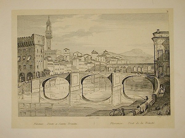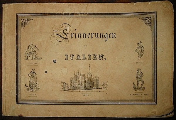 Album (cm.26x18). Raccolta di 25 tavv. incise su acciaio intercalate da pagine di colore verde con versi o brevi prose in lingua tedesca (da celebri Autori, tra i quali Wagner, Goethe, Schiller, Manzoni, Novalis, ecc.) che riguardano i luoghi raffigurati (Livorno, Pisa, Firenze, Portoferraio, Fiesole, Siena, Arezzo). Bross. editoriale figurata (alcune piccole mancanze al piatto posteriore e lievi segni di usura). Una piccola macchia sulla tav. di Portoferraio altrimenti buon esemplare.