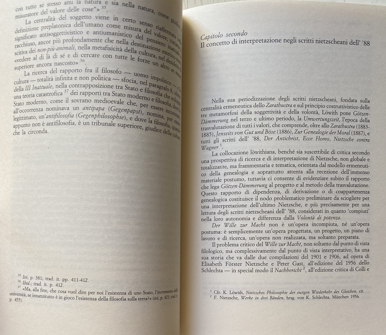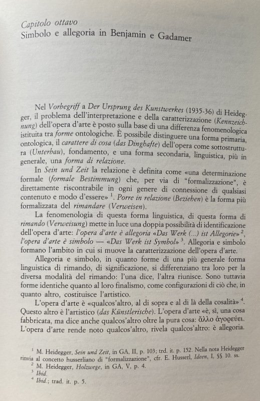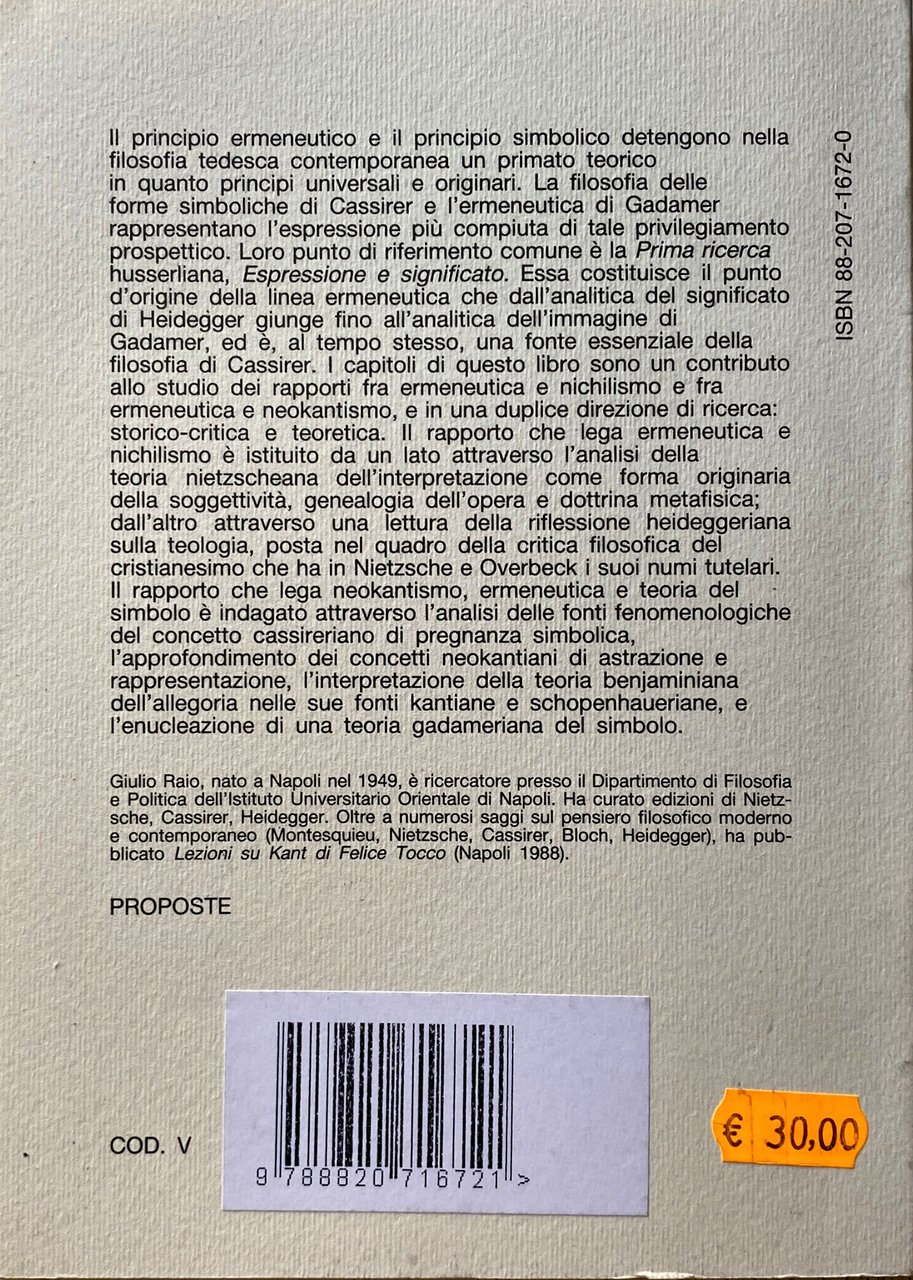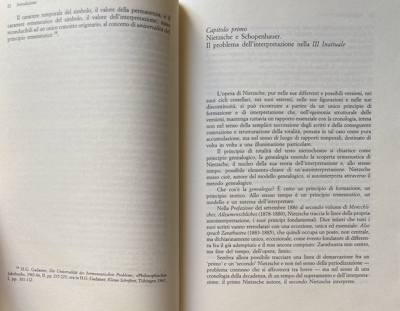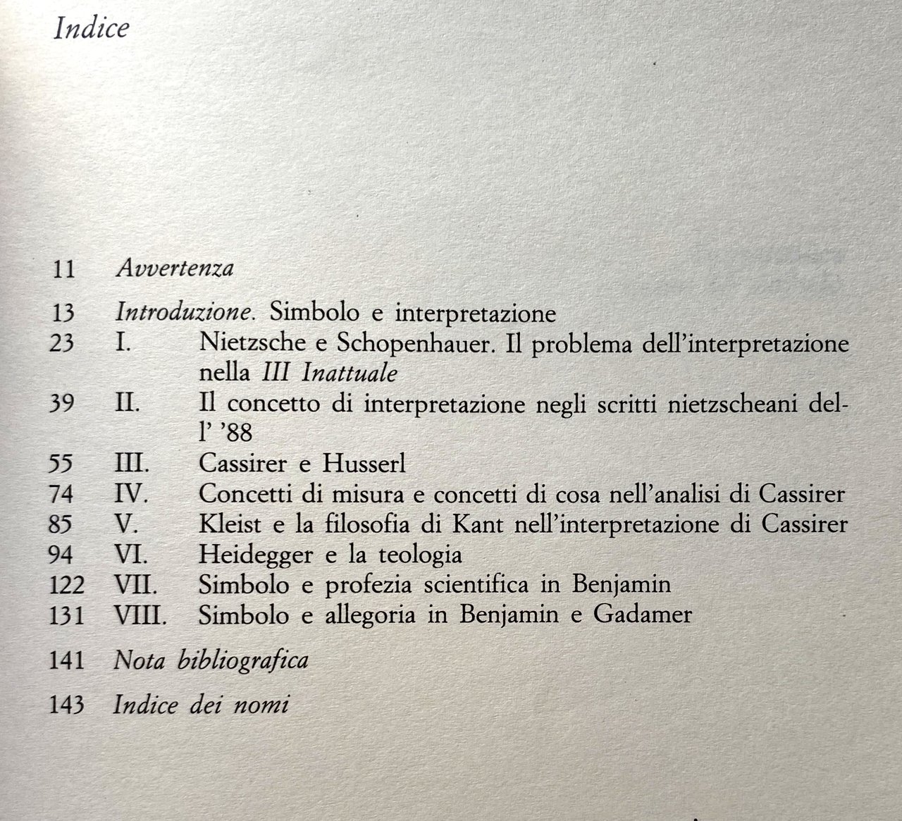 Soggetti: Filosofia, Ermeneutica, Teorie del simbolo, Edmund Husserl, Ernst Cassirer, Gadamer, Martin Heidegger, Ricerche logiche, Fenomenologia, Simbolismo, Estetica, Nichilismo, Neokantismo, Genealogia, Metafisica, Teologia, Critica filosofica, Cristianesimo, Nietzsche, Overbeck, Pregnanza simbolica, Astrazione, Rappresentazione, Interpretazione, Benjamin, Allegoria, Schopenhaueriane, Inattuale, Misura, Heinrich von Kleist, Kant, Bachofen, Profezia, Bibliografia, Riferimento, Libri fuori catalogo, Saggi, Simbolizzazione, Metafora, Letteratura, Mito, Fiaba, Arte, Crepuscolo degli idoli, Semiotica, Rede, Discorso, Leben, Immagine, Einstein, Relatività, Gnoseologia, Linguaggio, Linguistica, Germania, Elias Canetti, Theodor Adorno, Carabellese, Carnap, Arnaud, Aristotele, Poetica, Berkeley, F. Creuzer, H. Cohen, P. Chiodi, F. Brentano, Giorgio Colli, Hegel, Cornelio Fabro, Dilthey, Foucault, Cartesio, Feuerbach, Fichte, Eric Fromm, E. Garulli, Eugenio Garin, André Gide, Eugenio Garin, Holderlin, Horkheimer, Jacobi, Jaspers, L. Klages, Lowith, Leibniz, Lukacs, Karl Marx, Marxismo, Thomas Mann, Ferruccio Masini, G. Moretto, G. Morel, M. Montinari, Mommsen, P. Natorp, Merleau-Ponty, Religione, Spiritualità, Chiesa, Studi critici, Esegesi biblica, Jean-Jacques Rousseau, P.A. Schilpp, Schelling, Sprache, Storica, Storiografia filosofica, Teoretica, Symbolischen Formen, Krois, Gianni Vattimo, Richard Wagner, Aby Warburg, Oggetto, Soggettività, Significato, Zarathustra, Wittgenstein, E. Zeller, Von Zenge, Scholem, Socrate, Reichenbach, Karl Rahner, A. Riegl, Tommaso d'Aquino, H. Usener, U. Regina, Todorov, Natura, Sostanza, Funzione, Giudizio, Nicolai Hartmann, Rifrazione, Freud, Russell, Idealismo simbolico, Sfera degli affetti, Kritische Gesamtausgabe, Schriften, Werke, Samtliche Briefe, Epistolario, Lettere, Gesammelte, Prima ricerca, Rimando, Struttura, Verweisung, Welt, Verhältnis Begriff, Segno, Zeichen, Ausdruche, Espressioni, Anzeige, Indicazione, Inferenza, Evidenza, Astetische Unterscheidung, Differenziazione, Stiftung, Wahrheit, Methode, Metodo, Platone, Cratilo, Ontologia, Dominio, Valore, Essere, Darstellung, Bedeutung, Anschauung, Eingeweihte, Iniziati, Umanesimo, Prefazione, Menschliches, Allzumenschliches, Wille zur Macht, Peter Gast, Stato, Antipapa, Gegenpapst, Bernoulli, Wissen, Cristianità, Analogie, Volontà di potenza, Philosophy, Hermeneutics, Theories of the symbol, Logical research, Phenomenology, Symbolism, Aesthetics, Nihilism, Genealogy, Metaphysics, Theology, Philosophical criticism, Christianity, Symbolic significance, Abstraction, Representation, Interpretation, Allegory, Out of date, Measurement, Prophecy, Bibliography, Reference, Out of print books, Essays, Symbolization, Metaphor, Literature, Myth, Fairy tale, Twilight of the idols, Semiotics, Speech, Image, Relativity, Gnoseology, Language, Linguistics, Germany, Descartes, Religion, Spirituality, Church, Critical studies, Biblical exegesis, Historical, Philosophical historiography, Theoretical, Object, Subjectivity, Meaning, Socrates, Thomas Aquinas, Nature, Substance, Function, Judgment, Refraction, Idealism, Sphere of affections, Epistolary, Letters, Gesammelte, First research, Reference, Structure, Sign, Expressions, Indication, Inference, Evidence, Differentiation, Method, Plato, Cratylus, Ontology, Domain, Value, Being, Initiates, Humanism, Preface, State, Antipope, Christianity, Analogies, Will to power