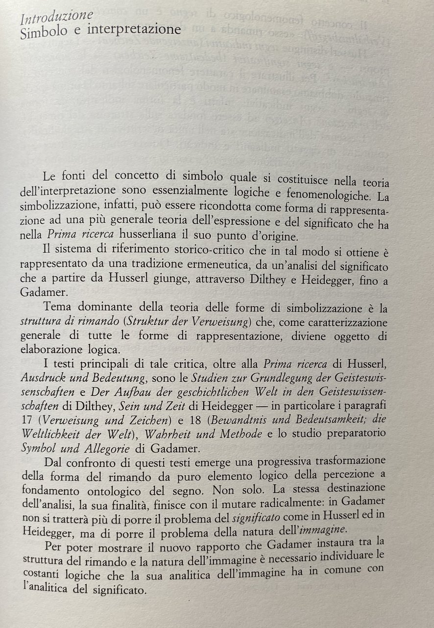 Il principio ermeneutico e il principio simbolico detengono nella filosofia tedesca contemporanea un primato teorico in quanto principi universali e originari. La filosofia delle forme simboliche di Cassirer e l'ermeneutica di Gadamer rappresentano l'espressione più compiuta di tale privilegiamento prospettico. Loro punto di riferimento comune è la Prima ricerca husserliana, Espressione e significato. Essa costituisce il punto d'origine della linea ermeneutica che dall'analitica del significato di Heidegger giunge fino all'analitica dell'immagine di Gadamer, ed è, al tempo stesso, una fonte essenziale della filosofia di Cassirer.