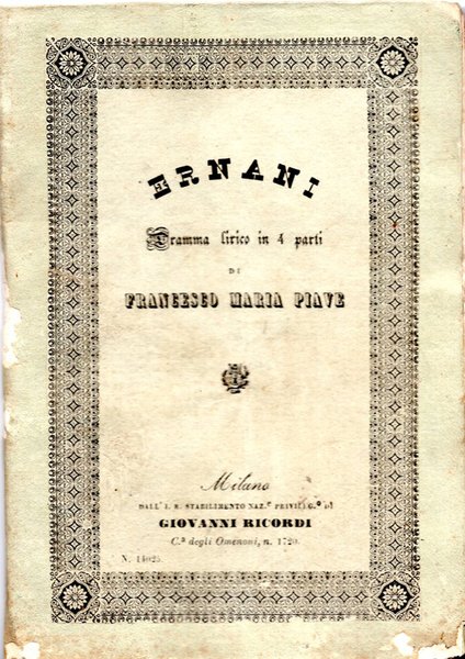 Libretto d’opera. Teatro Argentina di Roma, Primavera 1844. Note manoscritte coeve a pag. 38. Elenco dei personaggi completo dei nomi degli interpreti tra cui Adelaide Fantuzzi Velli, Giuseppina Leva, Francesco Ciaffei e Luigi della Santa.
