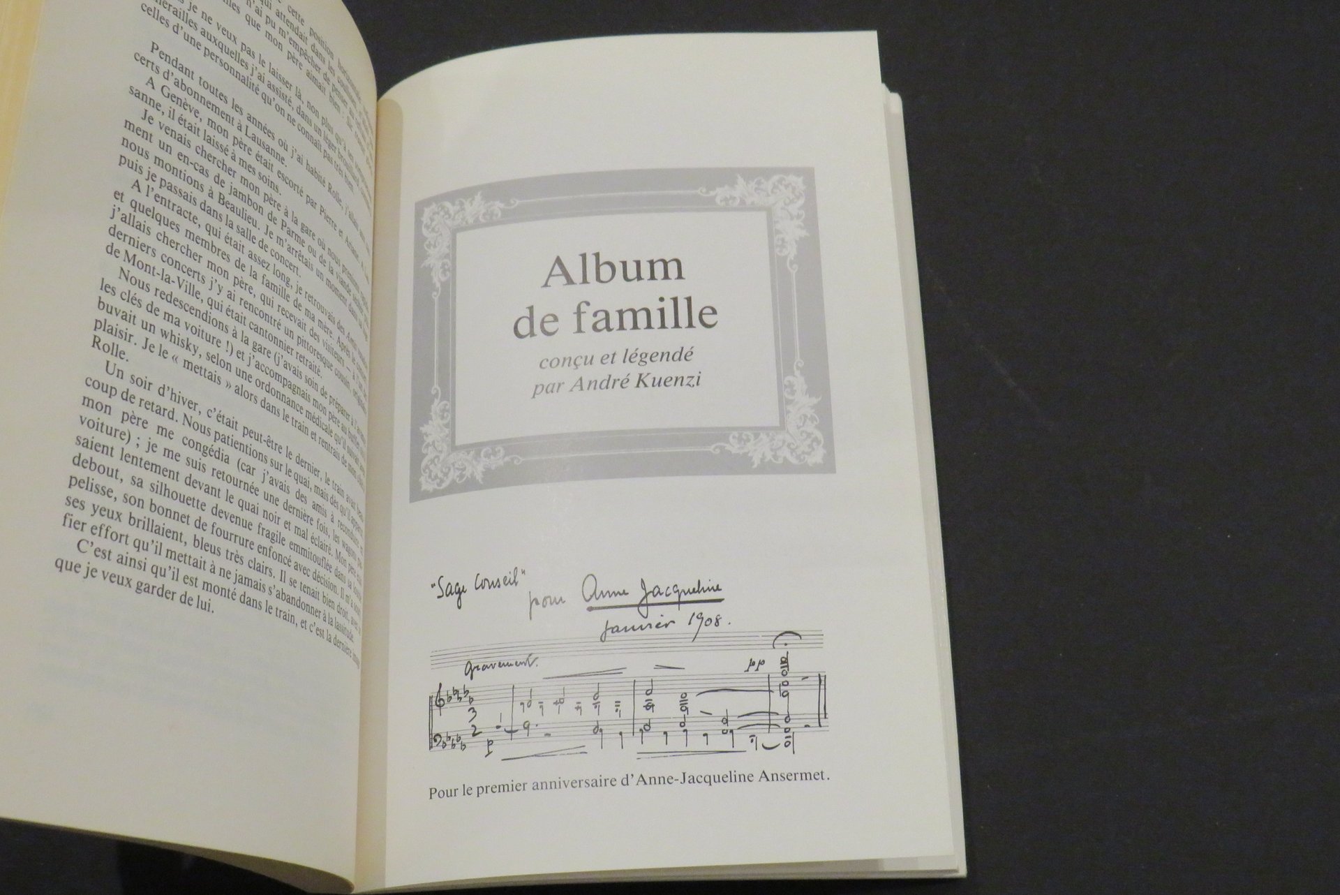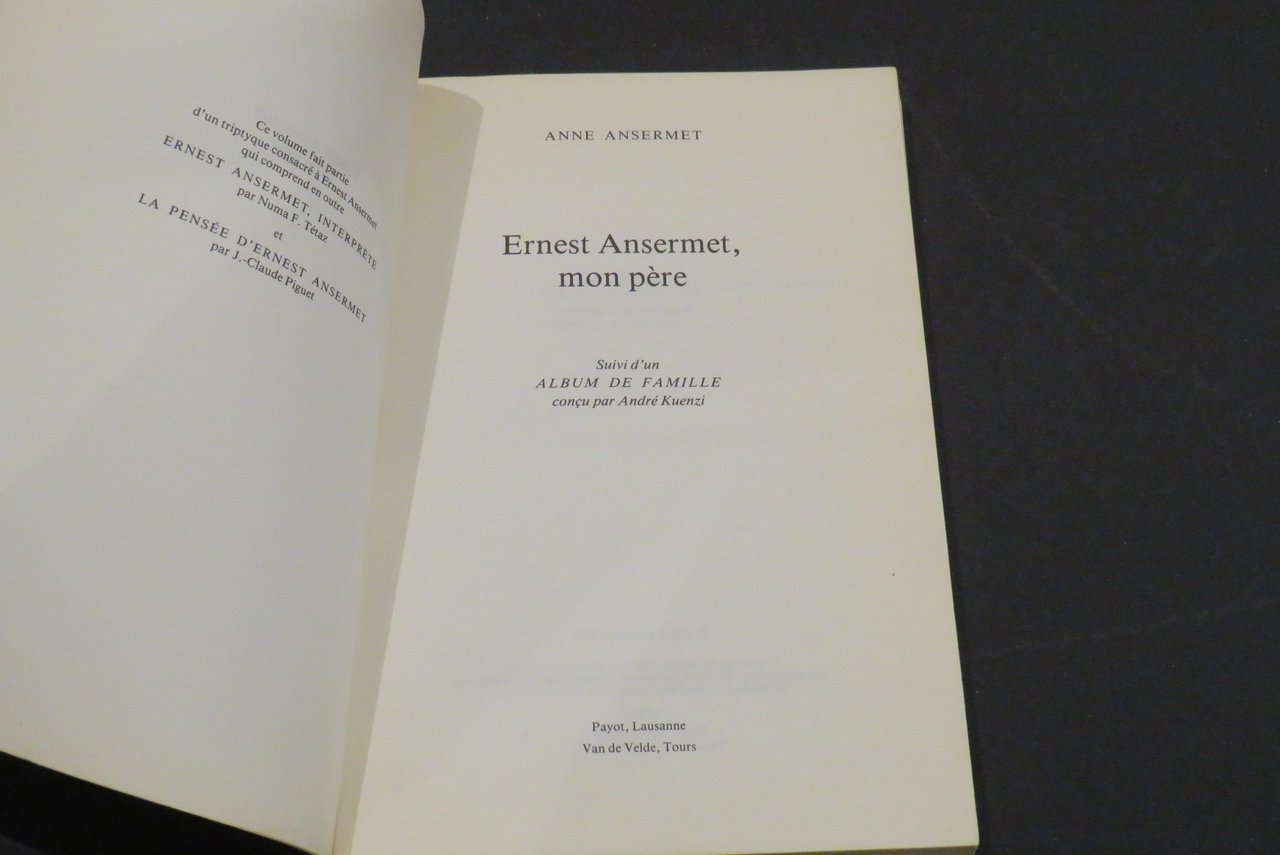 Lausanne, Editions Payot 7 Van de Velde, 1983. In -8 (mm. 150,3x220,2), pp. 192, con numerose illustrazioni e fotografie in nero nel testo. Brossura editoriale illustrata in nero al piatto anteriore, con Ernest Ansermet e sua figlia Anne. "Album de famille conçu et légendé par André Kuenzi" (pp. 128-190). Breve biografia dell’autore al piatto posteriore. Lievi mancanze ai margini della brossura, ma nell’insieme buon esemplare.