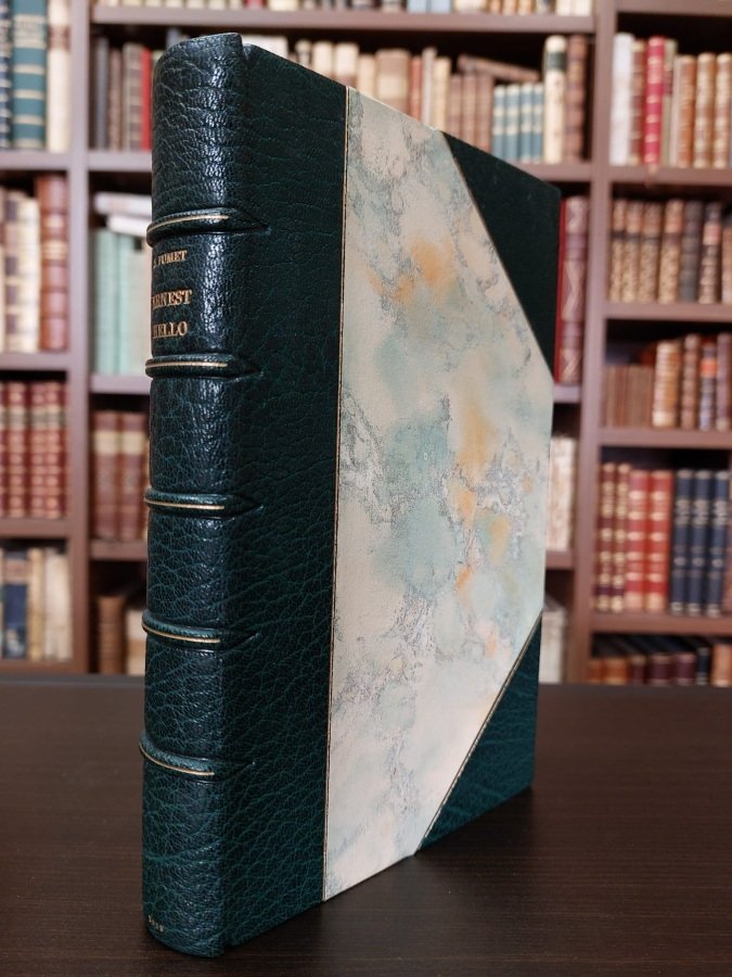 <span style="font-style: normal;">In-8° (cm. 20,2), elegante legatura in mezza pelle verde e angoli, dorso con titolo e filetti in oro ai nervi, taglio superiore dorato, risguardi in carta azzurra, conservata la brossura originale a colori, custodia in cartonato rigido marmorizzato; pp. 250 [2] in ottimo stato; 1 ritratto xilografico di Ernest Hello inciso da Louis Bouquet nel testo. Edizione originale. Esemplare n. 18 di 30 impresso </span><i>sur Hollande</i>. In ottimo stato. (NF9)