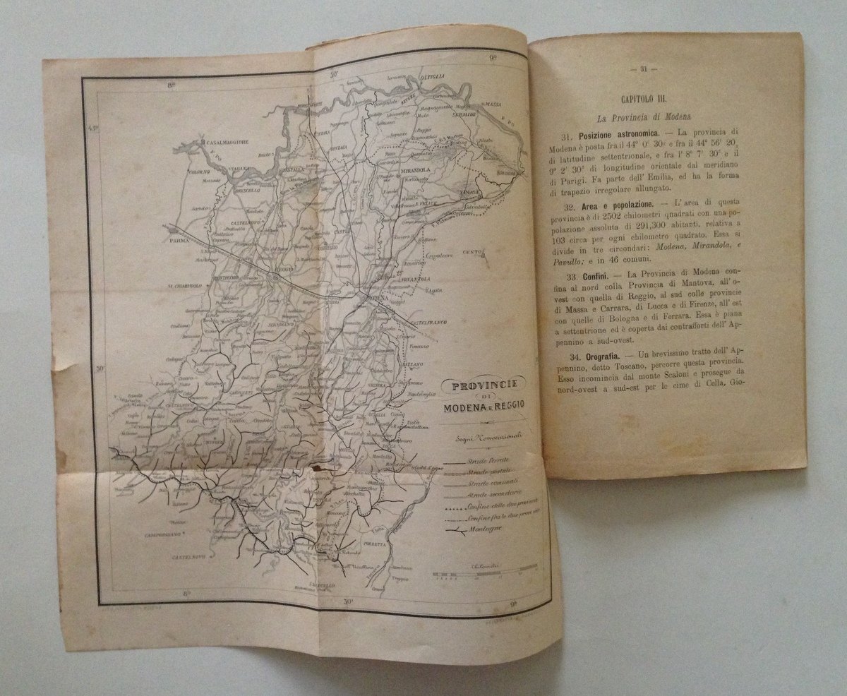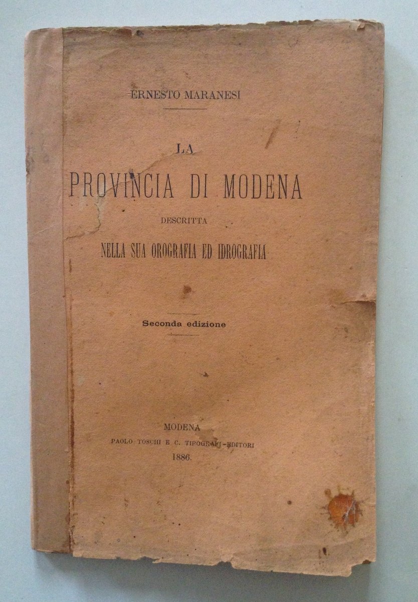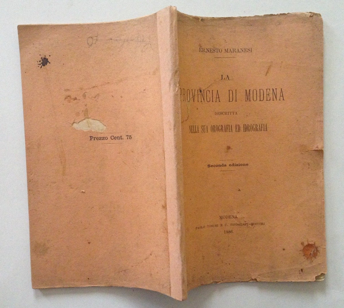 Ernesto Maranesi, La provincia di Modena descritta nella sua orografia ed idrografia Paolo Toschi e C. Tipografi-Editori, Modena 1886, cm 22x14, pp 74, 1 pianta ripiegata, 2° ed., brossura ed. Condizioni di conservazione. Esemplare in buono stato con tracce d'uso e del tempo; brossura editoriale con alcune pieghette, strappetti e mancanze ai piatti, ai margini e agli angoli; interni buoni con bruniture e con qualche rara annotazione a penna. MOD.01OP00019 MT