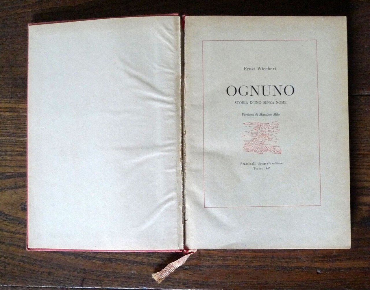 - Ernst Wiechert,OGNUNO.STORIA D'UNO SENZA NOME.Versione di Massimo Mila.Frassinelli tipografo editore, Torino 1947,QUARTA EDIZIONE,ristampa identica alla precedente pubblicazionedel 29 febbraio 1944,copertina rigida, rilegatura in cartoncino,19x13 cm., pp.XVI-298,titolo dell'opera originale: JEDERMANN.Gheschichte eines Namenlosen,peso: g.300