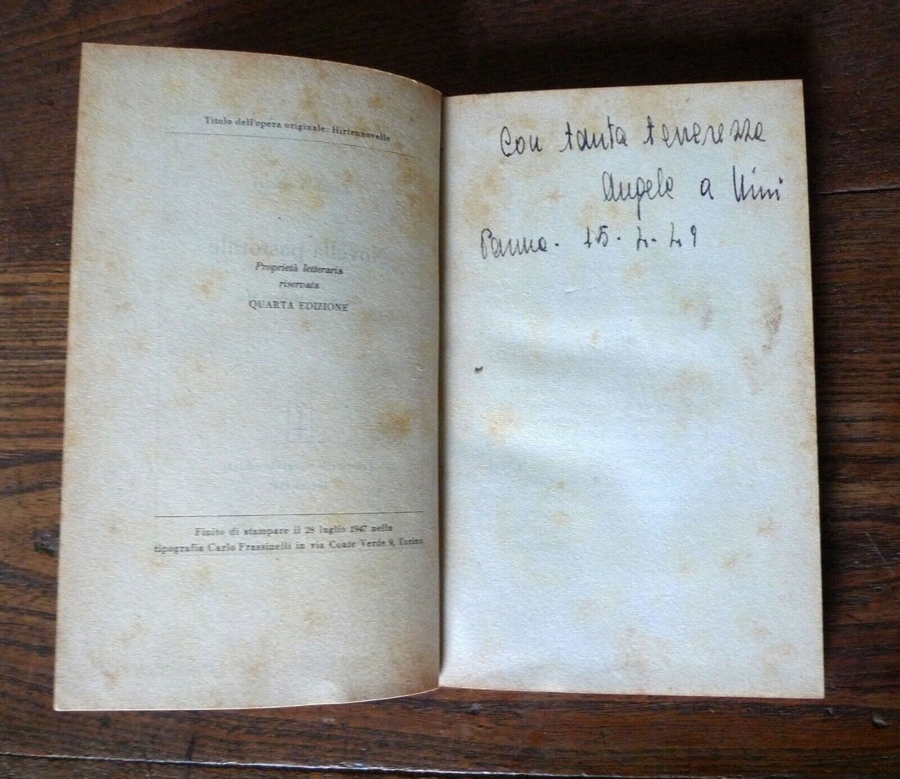 - Ernst Wiechert,NOVELLA PASTORALE.Versione di Massimo Mila.Frassinelli tipografo editore, Torino 1947,QUARTA EDIZIONE,copertina rigida, rilegatura in cartoncino,17x10 cm., pp.VIII-110,titolo dell'opera originale: Hirtennovelle,COLLANA DI OPERE BREVI n.1peso: g.100
