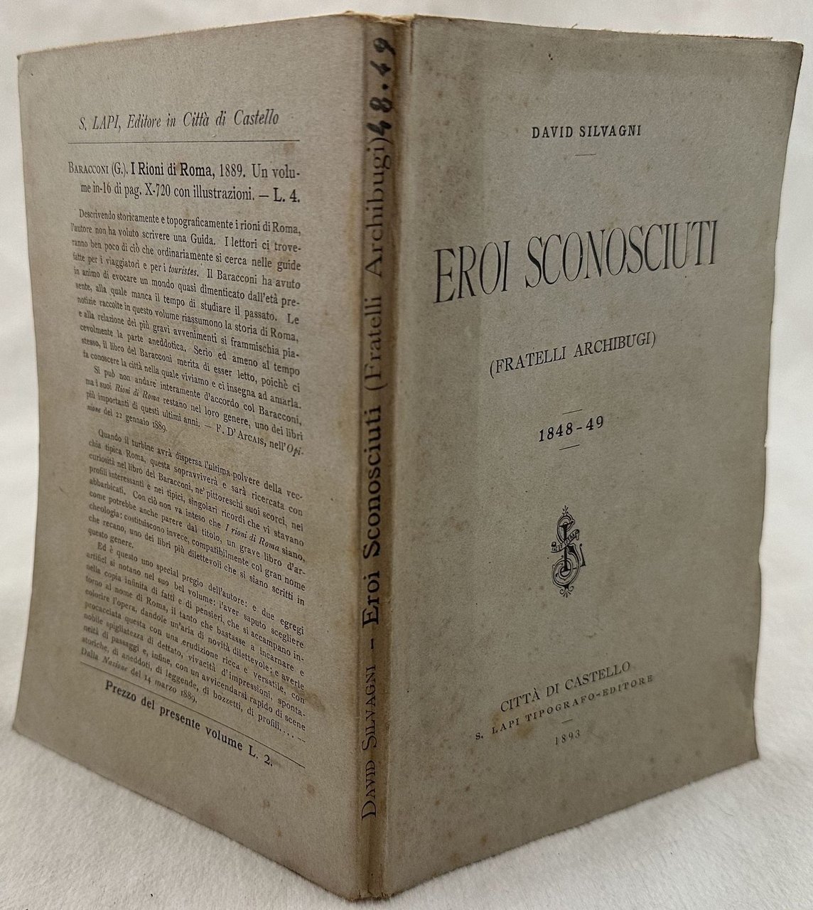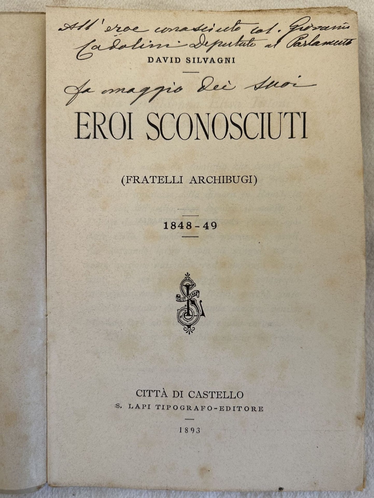 Interessante pubblicazione del 1893 su Francesco (Ancona 1828-1849) e Alessandro Archibugi (Ancona 1829-1849) patrioti combattenti volontari nella difesa della Repubblica Romana. Entrambi morirono a seguito delle ferite riportate nello scontro a fuoco dell'11 giugno 1849 nei pressi di Ponte Milvio contro le truppe francesi. Dedica dell'autore David Silvagni senza firma al deputato al Parlamento Giovanni Cadolini. In buone condizioni. Copertina editoriale in buone condizioni generali con lievi usure ai margini e dorso. Legatura in buone condizioni. All'interno le pagine si presentano in buone condizioni con fioriture. In 8. cm. 19,5x12,5. Pp. 140Interesting pamphlet of 1893 about Francesco (Ancona 1828-1849) and Alessandro Archibugi (Ancona 1829-1849) patriot fighters in the defence of Repubblica Romana.<BR>They both dye after injuries of the fight of 11th of june 1849 near Ponte Milvio against french troops <BR>Dedication of the author David Silvagni without signature to the deputee to the Parliament Giovanni Cadolini. In good conditions. Editorial cover in good general conditions lightly worn in the extremities. Binding in good conditions. Inside pages are in good conditions with foxing. In 8. cm. 19,5x12,5. Pp. 140