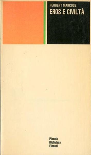 6. ed. 280 p. ; 18 x 11 cm. Piccola biblioteca Einaudi. Questo libro è uno dei più noti (e più discussi) di Marcuse e sviluppa con singolare vigore le premesse della filosofia sociale di Freud. Il libro conferma le migliori qualità del Marcuse critico, impegnato in una spietata diagnosi dei mali che affiggono la società occidentale. Titolo originale dell'opera: «Eros and Civilisation.A Philosophical Inquiry into Freud». Traduzione di Lorenzo Bassi. Introduzione di Giovanni Jervis. Brossura editoriale, coperta in cartoncino flessibile colorato (b/n e verde/arancione). Timbro ex libris nel front. Codice libreria 3964.