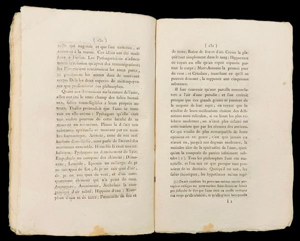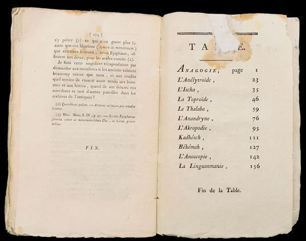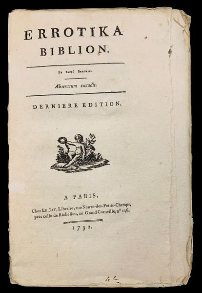 In 4° piccolo (21x14 cm); (4), 174, (2) pp. Brossura muta coeva azzurrina. Una piccola integrazione al margine alto del piatto posteriore. Un piccolo restaura al margine alto dellulti ma carta con integrazione di carta che tocca due lettere della parola Table presente nel margine alto della pagina. Seconda rarissima edizione, di questo celebre scritto erotico del grande scrittore, diplomatico, rivoluzionario, agente segreto e uomo politico francese, Honoré Gabriel Riqu eti conte di Mirabeau (Le Bignon-Mirabeau, 9 marzo 1749 Parigi, 2 aprile 1791), famoso anche per la sua bruttezza ed i suoi comportamenti libertini. Famoso uomo politico alla morte venne seppellito al Panteon in pompa magna da presidente dell'Assemblea Nazionale, ma circa tre anni dopo, venuti alla luce i suoi rapporti con Luigi XVI e Maria Antonietta fu disseppellito e le sue ceneri, secondo la leggenda, vennero disperse nelle grandi fogne di Parigi. Lopera,scritta durante un periodo di prigionia di Mirabeau nel castello di Vincennes a causa di problemi debitori susseguenti al divorzio dalla moglie (divorzio che fece scandalo allepoca), tratta delle varietà nella sessualità nel mondo antico. Stampato nel 1783 lopera venne subito bandita, ancor p rima di essere immessa sul mercato, tanto che sembra se ne salvarono solo 14 copie. La seconda edizione, ristampata nel 1792, anche in questo caso sfidando la censura venne anchessa stampata in pochissime copie. Lo scritto cita e rilegge passi biblici e con ironia, gusto della finzione, giochi di specchi, straniamenti, contaminazioni, li collega con altre tradizioni portando il lettore a muoversi in situazioni eccitanti di grande impatto erotico che si susseguono durante tutto il libro. Lopera fu molto apprezzata da Guillaume Apollinaire. Rif. Bibl.: Gay, Ouvrages relatifs à l'amour, II, 150.
