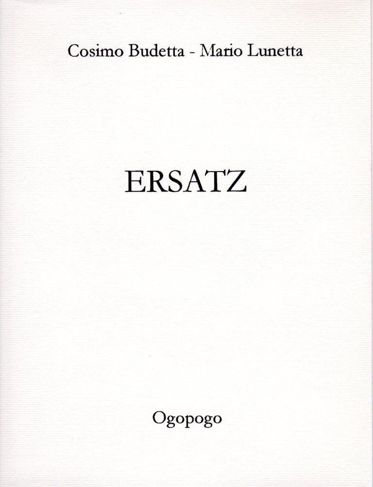 Ersatz, prima edizione settembre 2000, formato 14 x 18,5.<BR>Copertina morbida di colore bianco con titoli in nero al piatto anteriore. Volume non rilegato.Stampe a secco di Cosimo Budetta, poesie di Mario Lunetta, intervento di Francesco Muzzioli.Edizione stampata in 80 copie numerate, nostra n. 45.<BR>Ottime condizioni.