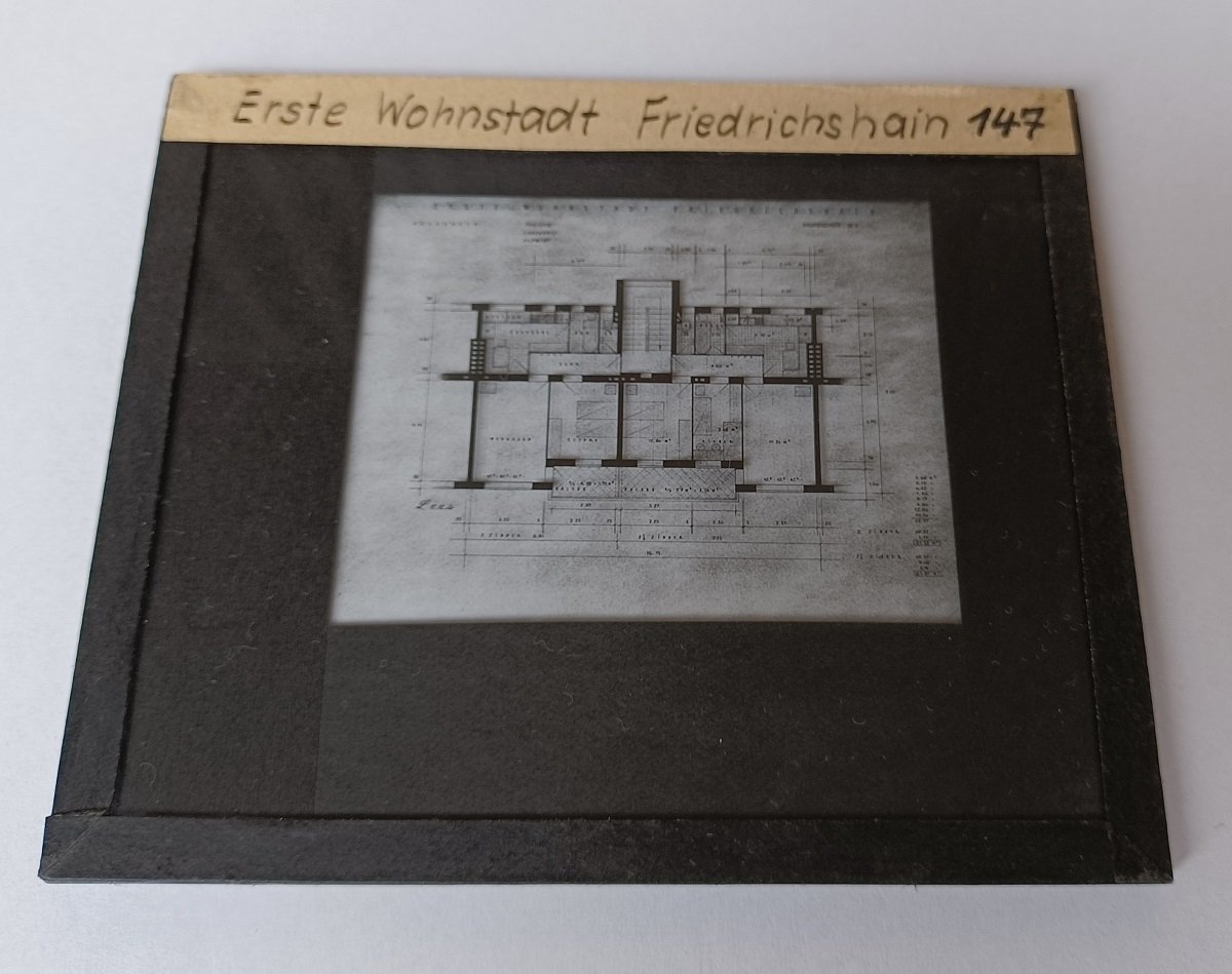 Das Diapositiv (Glasplatte) enthält einen Grundriss mit der genannten Beschriftung und datiert auf Dezember 1950. Der detaillierte Grundriss zeigt mittig ein Treppenhaus, beidseitig dann je eine Wohnfläche. Unter dem Grundriss ist vermerkt: 2 Zimmer = 51,32 qm / 2 1/2 Zimmer = 61,81 qm. Auch sind zahlreiche Maße am Grundriss sowie auch Zimmerbezeichnungen etc. angegeben. Aufgrund des frühen Datums gehen wir davon aus, daß es sich hier womöglich um den Grundriss für die von Paulick realisierten Wohnhäuser in der Graudenzer Straße (Berlin-Friedrichshain) handelt. Hierfür spräche auch, daß beide Wohnungen kleine und nebeneinander liegende Balkone haben. Die Beteiligung Paulicks an einzelnen Wohnblöcken der "Stalinallee" stand hingegen erst 1952/53 im Raum. Möglich wär jedoch auch dass es sich hier um einen letztlich nicht realisierten Entwurf des Architektenkollektivs Paulick / Ladendorf / Schmidt handelt, was durchaus auch in die Praxis der Zeit und den einsetzenden Richtungsstreit über die Architektur im Sozialismus passen würde. Zur Einsichtnahme und eigenen Überprüfung offerieren wir eine möglichst gute Abbildung. Architekturgeschichtlich interessante Archivalie zum Wiederaufbau Berlins in den frühen 1950er Jahren!