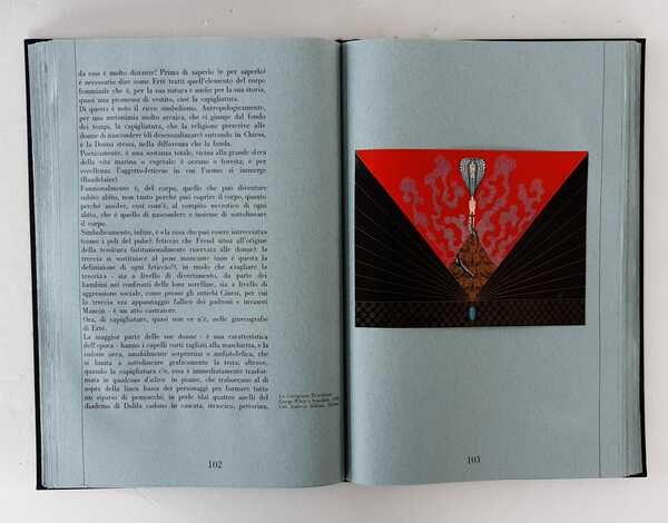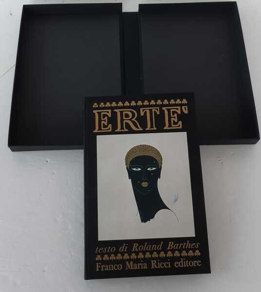 In folio (mm.355x240), pagg.189-cc.nn.1. Legatura editoriale in tutta tela nera, con grande inserto al piatto anteriore con figura policroma e titolo in oro al dorso. Esemplare recante la firma autografa di Erté, datata 24-2-1971, di questo ricercato saggio che Roland Barthes dedicò alla figura del pittore, scultore e costumista russo naturalizzato francese, fra i massimi rappresentanti dell’Art Decò. Le splendide tavole di cui è ornato il testo, riproducono il celebre e fantasioso alfabeto, alcune iconiche figure femminili, visionari costumi e capi d’abbigliamento, copertine di riviste, fregi di soggetto onirico. Impresso su carta vergellata azzurrina delle Cartiere Miliani di Fabriano, il volume fu elegantemente rilegato a cura di Torriani Milano e si presenta perfettamente conservato nella sua custodia editoriale con piatti in cartonato decorato e dorso in tela che reca il titolo. Stampato nel mese di novembre 1970, ottimo esemplare.
