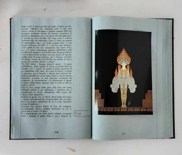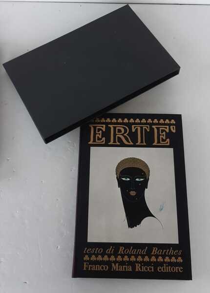 In folio (mm.355x240), pagg.189-cc.nn.1. Legatura editoriale in tutta tela nera, con grande inserto al piatto anteriore con figura policroma e titolo in oro al dorso. Ricercato saggio che Roland Barthes dedicò alla figura del pittore, scultore e costumista russo naturalizzato francese, fra i massimi rappresentanti dell’Art Decò. Le splendide tavole di cui è ornato il testo, riproducono il celebre e fantasioso alfabeto, alcune iconiche figure femminili, visionari costumi e capi d’abbigliamento, copertine di riviste, fregi di soggetto onirico. Impresso su carta vergellata azzurrina delle Cartiere Miliani di Fabriano, il volume fu elegantemente rilegato a cura di Torriani Milano e si presenta perfettamente conservato nella sua semplice custodia editoriale. Stampato nel mese di novembre 1970, ottimo esemplare.