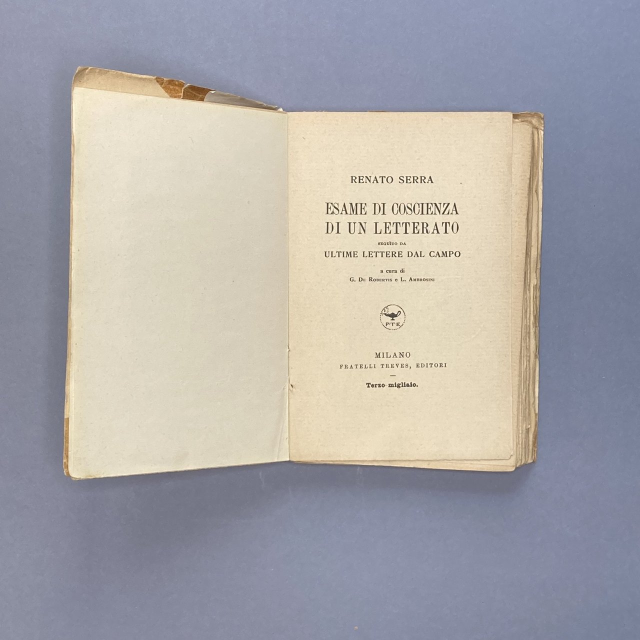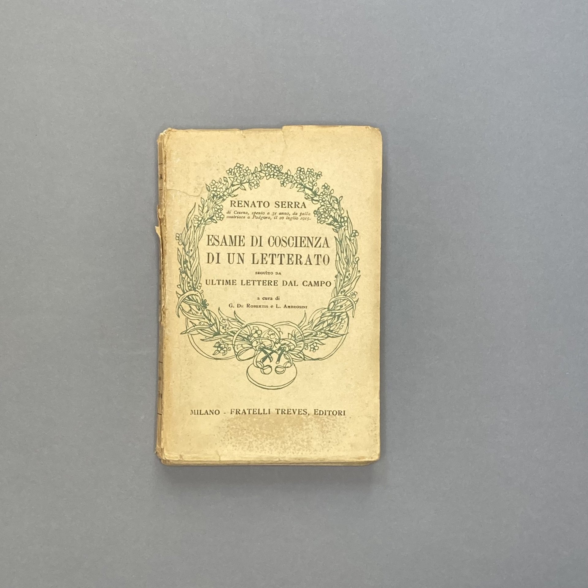 16°, cm 17, pp. 160. Antiporta con fotografia ritraente Renato Serra e accanto il suo tumulo sul Podgora. Brossura editoriale con titoli entro cartiglio floreale al piatto. A cura di Giuseppe De Robertis e Luigi Ambrosini. Quest'opera emblematica si interroga sul senso della letteratura e del suo rapporto con la realtà sociale, ben rappresenta il conflitto tra interventismo e pacifismo tra gli intellettuali italiani dell'epoca. Essa è frutto di una profonda riflessione morale sul ruolo del critico letterario che secondo l'autore è chiamato a partecipare alla Prima guerra mondiale. Esemplare buono, dorso rinforzato dall'interno.. *** TUTTI I NOSTRI LIBRI SONO VISIBILI PREVIO CONTATTO MAIL O TELEFONO NELLA NUOVA SEDE DI MILANO: LIBRERIA COSMOPOLIS, VIA JOMMELLI, 22. ***
