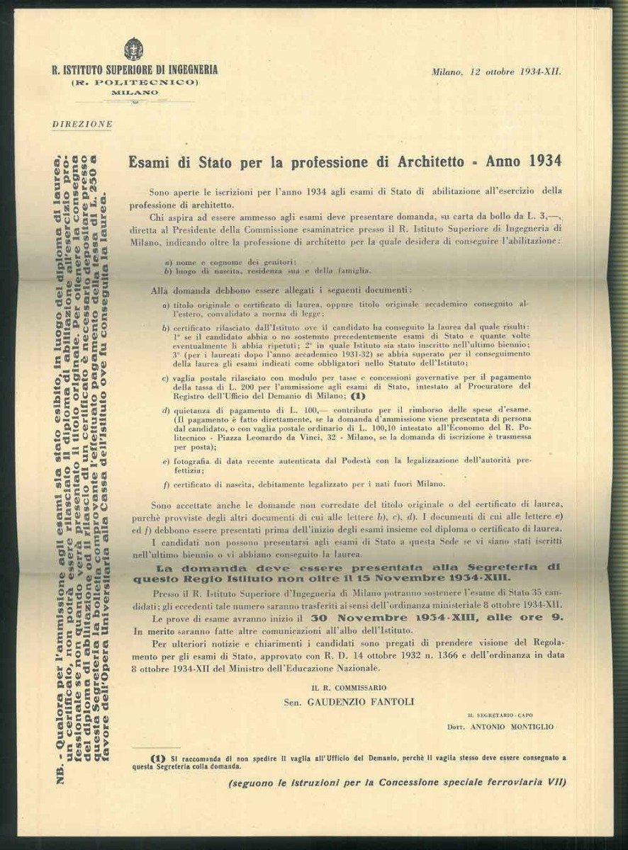 <p>35x25 cm, doppio foglio stampato su due pagine con norme per l'iscrizione all'esame presso il R. Politecnico di Milano. Piega in tre parti con mittente prestampato e spazio per indirizzo di spedizione</p>