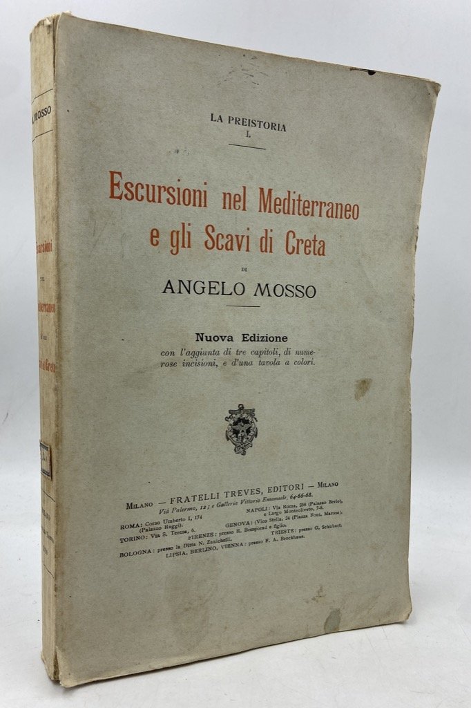 Brossura editoriale a stamoa, cm 25x16, pp XII 355 (1), 176 figure in nero, 1 tavola in nero e una a colori. Completo e in barbe, lievi fioriture e segni del tempo, strappetti sul margine delle pagine 241-248. Angelo Mosso, medico e alpinista, sperimentatore e scienziato che alla montagna dedico buona parte della vita e degli studi, ebbe tra le sue eclettiche passioni anche quella dell’archeologia, e lasciò alcuni interessanti lavori sulle antiche civiltà mediterranee. Questo volume dedicato alla civiltà minoica, qui in seconda e definitiva edizione, è il primo di una incompiuta trilogia intitolata alla Preistoria, e attraverso l’analisi di numerosi scavi e reperti descrive onumenti, arti e svariati aspetti della vita dell’epoca. Mosso nega inoltre categoricamente l’origine indogermanica della civiltà mediterranea e circa il popolo ariano e «l’antipatico problema della razza» afferma con semplicità: «se qualcuno mi domanda cosa esista nelle razze bianche per il lato fisico e l’intellettuale che non abbi un uomo di una qualsiasi di queste razze, rispondo: nulla».