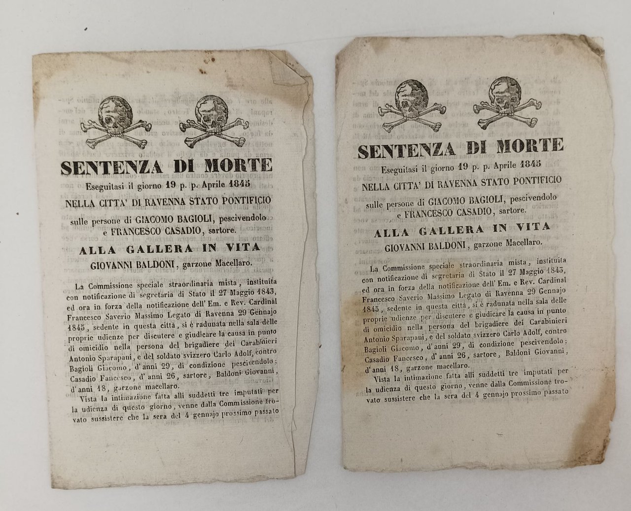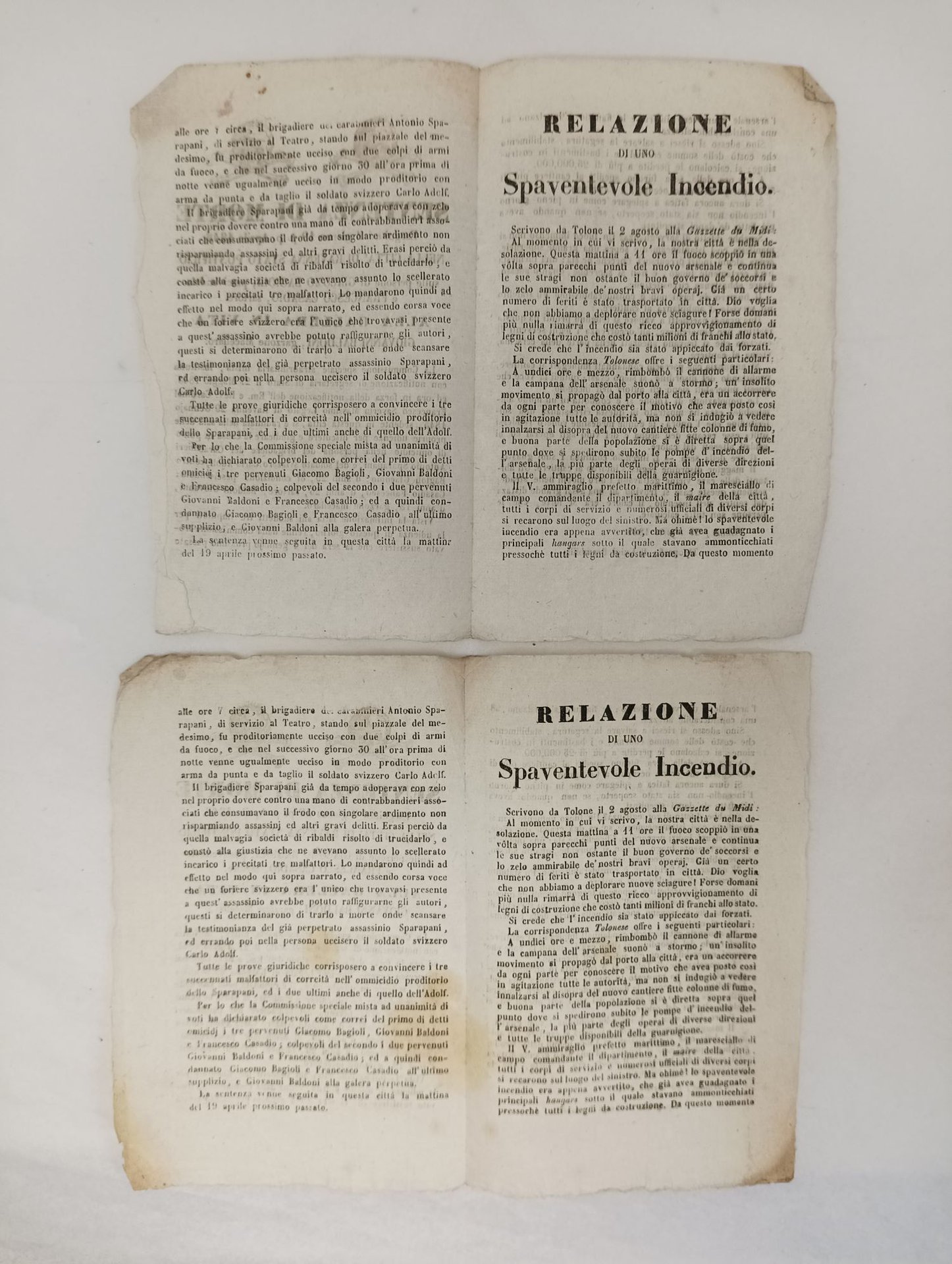 >in-4 (mm 200x150), pp.4. Le prime due pp. comprendono la Sentenza di Morte proclamata in seguito all'omicidio del brigadiere dei Carabinieri Antonio Sparapani e del soldato svizzero Carlo Adolf, per opera di Bagioli Giacomo, anni 29, pescivendolo; Casadio Francesco, anni 26, sartore; Baldoni GIovanni, anni 18, garzone macellaro. Seguono 2 pp. con la "Relazione di uno Spaventevole Incendio" accorso a Tolone il 2 agosto. "....gli abitanti dele case vicine gettavano i loro mobili nelle strade, sebbene queste case si trovino ad una assai grande distanza dal centro dell'incendio, il calore era si forte che le persone son tutte calcinate".