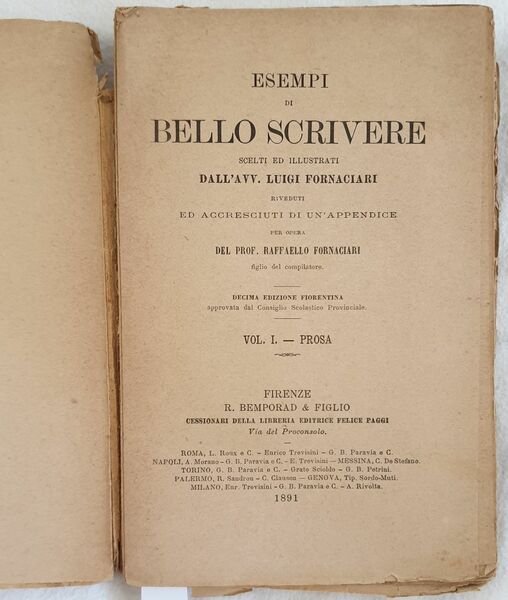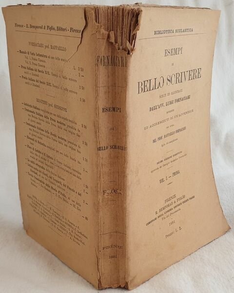 Edizione del 1891 di questa interessante opera letteraria di Luigi Fornaciari (1798-1858).<BR>L'opera è in un volume ed è completa. All'interno numerosi testi per scrivere bene in prosa.<BR>Nella prima parte cenni biografici di Luigi Fornaciari, lettera allo stampatore Giuseppe Giusti, Considerazioni generali su diversi tempi della lingua italiana poi i vari testi: favole; narrazioni; descrizioni (Dante, Poliziano, Tasso ecc.), Nature e ritratti di uomini illustri, lettere, dialoghi, stile didascalico, Stile oratorio, Iscrizioni, Appendice agli esempi di prosa ecc.<BR>In mediocri condizioni.<BR>Copertina in discrete condizioni generali con lievi usure e parti mancanti ai margini e dorso. Legatura in mediocri condizioni. All'interno le pagine si presentano in discrete condizioni con fioriture e mende. In 8. Dim. 19,5x13 cm. Pp. 407. Edition of 1891 of this litterary work by Luigi Fornaciari (1798-1858).<BR>The work is in one volume and it is complete. Insdie different texts to write in prose. In the first part biography of Luigi Fornaciari, letter to the publisher Giuseppe Giusti, General considerations about different times of italian language: tales, narration, description (Dante, Poliziano, Tasso ecc.), Nature and portrait of illustrious men, letters, dialogues, didascalic style, Oratoria, Inscriptions, Appendix to example of prose ecc.<BR>In poor conditions. Editorial cover in fair general conditions lightly worn in the extremities. Binding in poor conditions. Inside pages are in fair conditions with foxings and usage signs. In 8. Dim. 19,5x13 cm. Pp. 407.