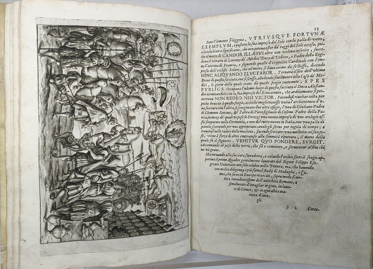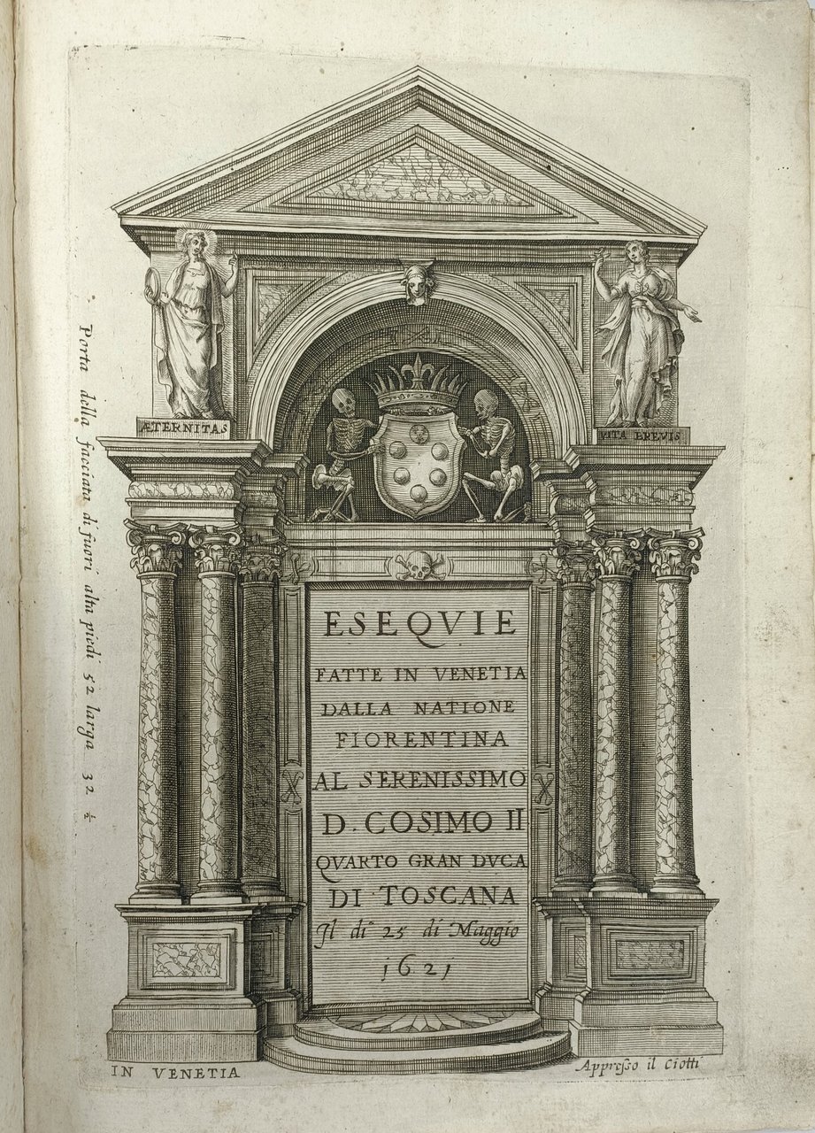 >2 parti in un vol. in-folio piccolo, ff. 24 (numeraz. continuata), leg. coeva p. perg., tit. calligr. ms. al dorso. Dedicato a Ferdinando II, figlio undicenne del defunto Granduca sotto la tutela della madre. Con 2 frontespizi inc. a motivo architettonico, ritratto di Cosimo II e 16 tavole finemente incise in rame da Francesco Valesio raffiguranti la pianta della chiesa dei SS. Giovanni e Paolo ove si svolse la cerimonia, il catafalco ed i dettagli delle decorazioni ed inoltre 8 dipinti allegorici di Matteo Ingoli detto il Ravennate che ornano la chiesa. Magnifico libro di feste, raro ed importante, impresso a ricordo del solenne rito funebre in onore di Cosimo II, deceduto a Firenze il 28 febbraio di quell'anno. Le sontuose cerimonie e onoranze svoltesi in Venezia furono volute dalla importante colonia di commercianti fiorentini presenti e operanti nella città lagunare. Ottimo esempl. (con ex-libris di Pietro Ginori-Conti). Vinet 609. STC, XVII sec., 321. Berlin Kat. 3201. Michel-Michel VII 156.