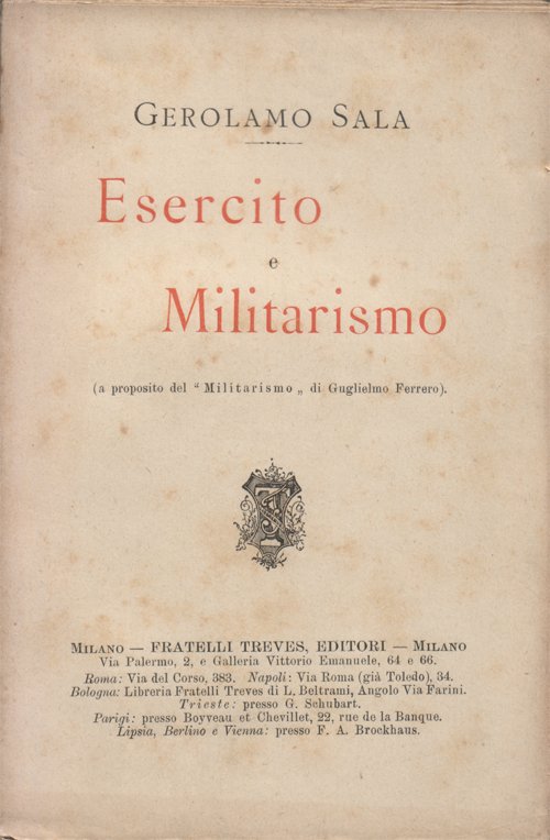 In-16° (cm 19x12,8), pp. (8), 104, (4), copertina editoriale. Parzialmente intonso. Indice: I. Le conferenze di G. Ferrero e il capitano F. Ranzi; Il nostro peccato; L'esercito durante la crisi del Maggio; La guerra alle istituzioni militari e al sentimento patriottico. II. G. Ferrero; La sua tesi; La giustizia della storia; Roma. III. Napoleone; Francia e Italia; Turchia e Sudan; Conquista civili della guerra; Impulsi guerreschi; Le vittime dell'ideale; Spirito militare; Fantocci paurosi. IV. L'equivoco nel Militarismo; L'aristocrazia militare; Origine della cortesia; Tipi italiani dimenticati; Il risorgimento italiano; G. Ferrero e l'esercito; Adua. V. Nazioni di sangue germanico; La Germania non è stato militarista; La guerra ispano-americana; La guerra nell'avvenire; Czar pietoso. VI. L'esercito e la sicurezza interna dello Stato; Le repressioni; Riassumiamo le nostre idee; Le conclusioni del Ferrero e le nostre; Ai giovani; Le verità umili e fondamentali.