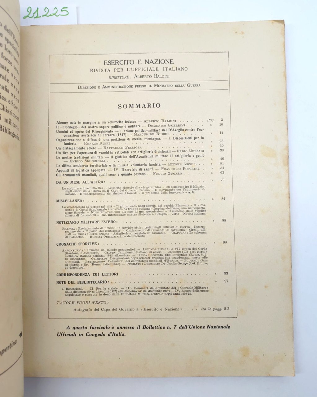 direttore Alberto Bandini copertina a colori disegnata da Vittorio Grassi, legatura morbida editoriale in condizioni accettabili, alcuni aloni sporcizie e fioriture ai piatti e al dorso, dorso con abrasioni ai margini, mancanze e alcuni strappi riparati, quarta di copertina con fioriture diffuse, tagli bruniti con fioriture, interno in discreto stato fioriture alle pagine interne che non vanno a disturbare la lettura, pagina da pagina 11 a pagina 15 vistose fioriture nel testo, vedere immagine, da pagina 1 a pagina 105 dimensioni cm 28,5 * 22,4 all'interno bollettino n. 7 dell'Unione nazionale ufficiale in congedo d'Italia con fioriture diffuse, alla prima pagina copia della lettera firmata Mussolini a stampa