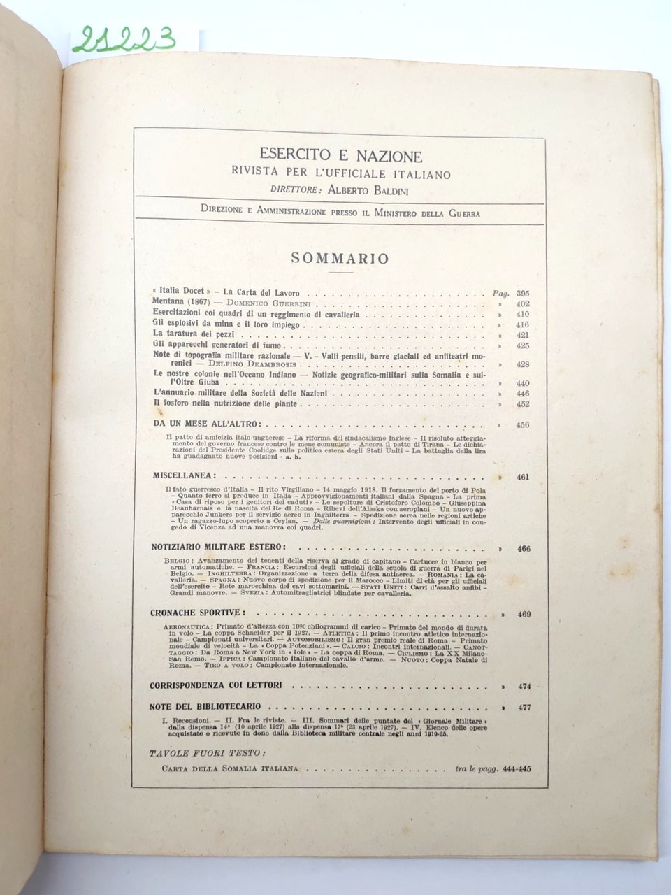 direttore Alberto Bandini copertina a colori disegnata da Vittorio Grassi, legatura morbida editoriale in condizioni accettabili con bruniture e fioriture diffuse ai piatti e al dorso, dorso con abrasioni e mancanze, quarta di copertina con aloni e macchie diffuse, alcune mancanze e un foro al margine superiore, tagli bruniti con sporcizie e fioriture diffuse, interno in discreto stato, fioritura le pagine interne che non vanno a impedire la lettura, una carta più volte ripiegata della Somalia fuori testo, da pagina 396 a pagina 488 dimensioni cm 28,5 * 22,4