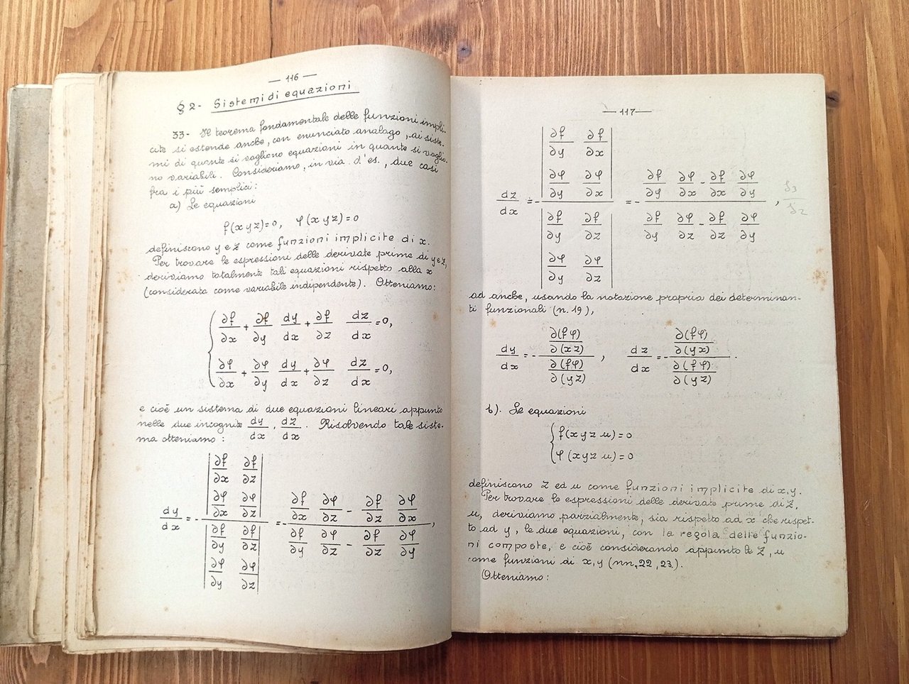 Opera completa in forma di dispense universitarie, compilate e stampate in carattere corsivo. Due brossure originali di 349 + 311 pagine. Dorso del primo volume ricostruito, fioriture ai piatti e occasionalmente alle carte, qualche intervento a matita leggera. Esemplari vissuti ma ben fruibili di una pubblicazione non comune, specie la seconda parte.