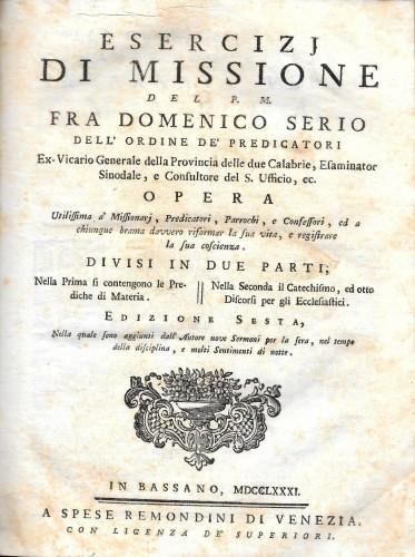 Esercizi di missione del p. m. fra Domenico Serio dell'Ordine de' Predicatori