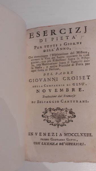 Volume in buone condizioni de "Esercizi di pietà" di Padre Giovanni Croiset, tradotto dal francese da Selvaggio Canturani