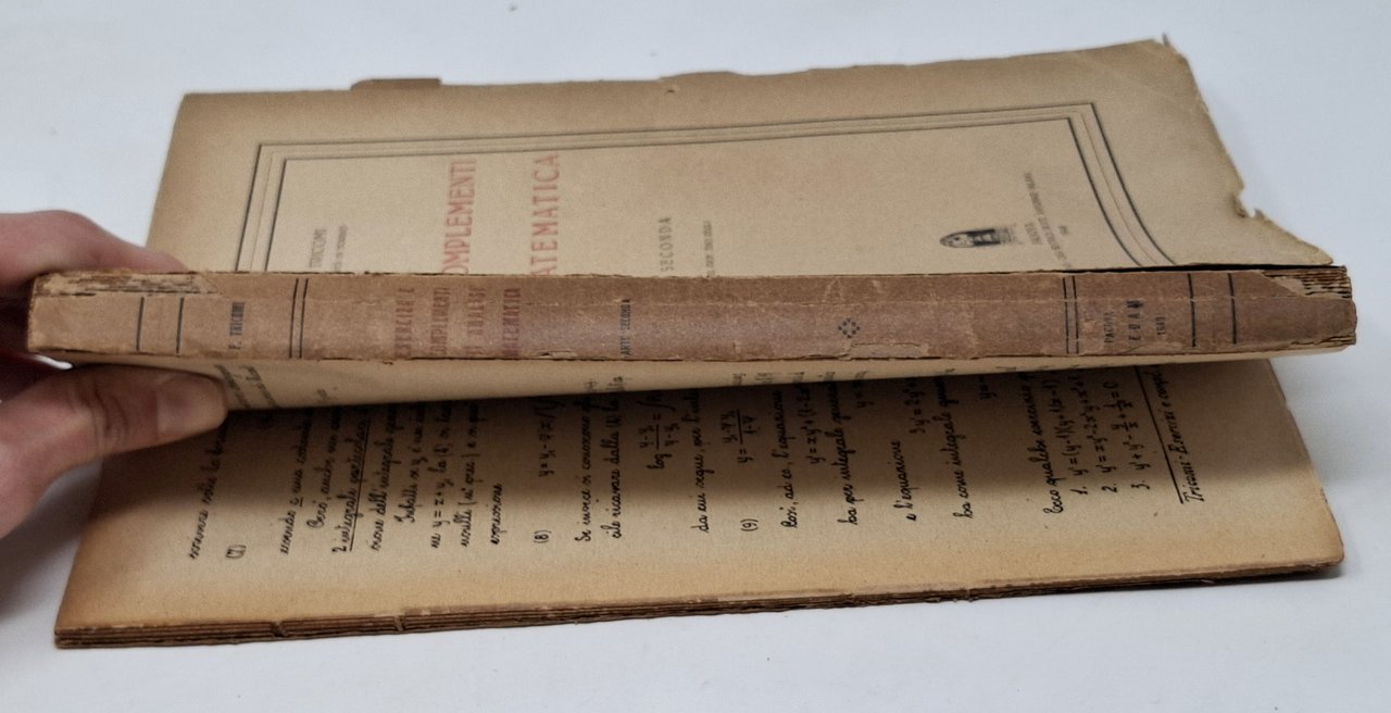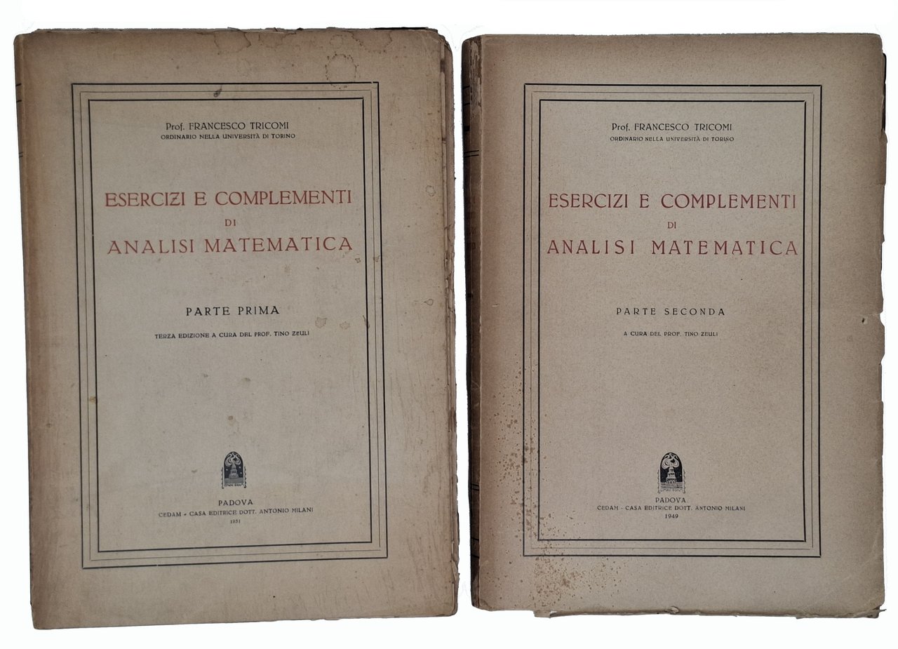Opera completa in due volumi: parte prima e parte seconda. Anno: 1949 (seconda parte), 1951, Terza edizione a cura del Prof. Tino Zeuli (parte prima). Formato: 18 x 25,5 cm circa. Pagine: XV + 391 (parte prima); VII + 376 (parte seconda). Stato di conservazione: La parte prima, pubblicata originariamente in dispense, è costituita dalla copertina che, come una cartellina, contiene al suo interno i fascicoli sciolti (non sono mai stati rilegati) mentre la parte seconda è stata rilegata editorialmente ma, a causa della fragilità del materiale (caratteristica tipica degli anni immediatamente successivi alla seconda guerra mondiale), il corpo del volume si è completamente diviso in due blocchi (la rottura si presenta in corrispondenza di pagina 305). Poichè il primo volume non è mai stato rilegato e il secondo presenta questa rottura è consigliabile una nuova rilegatura. La parte prima presenta una piccola mancanza sulla copertina in corrispondenza del margine inferiore del dorso e bordi frastagliati di alcuni fogli. Sono altresì presenti alcuni aloni marginali sulle prime e sulle ultime pagine. Una piccola macchia di inchiostro sul taglio verticale degli ultimi fascicoli.La copertina anteriore della parte seconda si presenta completamente staccata dal volume che presenta taglietti sui margini della copertina, tagli sul dorso (che sembrano indicare la prossima rottura in altri punti del volume) e una mancanza sul margine superiore del dorso. In generale, tolti gli aloni del tutto marginali segnalati nella parte prima, i difetti riguardano per lo più le rilegature dei volumi mentre il testo è perfettamente leggibile e fruibile. Non sono presenti annotazioni, sottolineature, firme d'appartenenza o altri segni nel testo. L'opera è considerata un testo didattico avanzato che raccoglie una vasta gamma di esercizi, esempi svolti e approfondimenti teorici relativi all'analisi matematica. Il libro copre argomenti come il calcolo differenziale e integrale, le serie numeriche e di funzioni, le funzioni di più variabili, le equazioni differenziali, complementi di teoria,. L'approccio è rigoroso ma orientato alla pratica, con l'obiettivo di consolidare la comprensione teorica tramite l'esercizio e l'applicazione concreta.