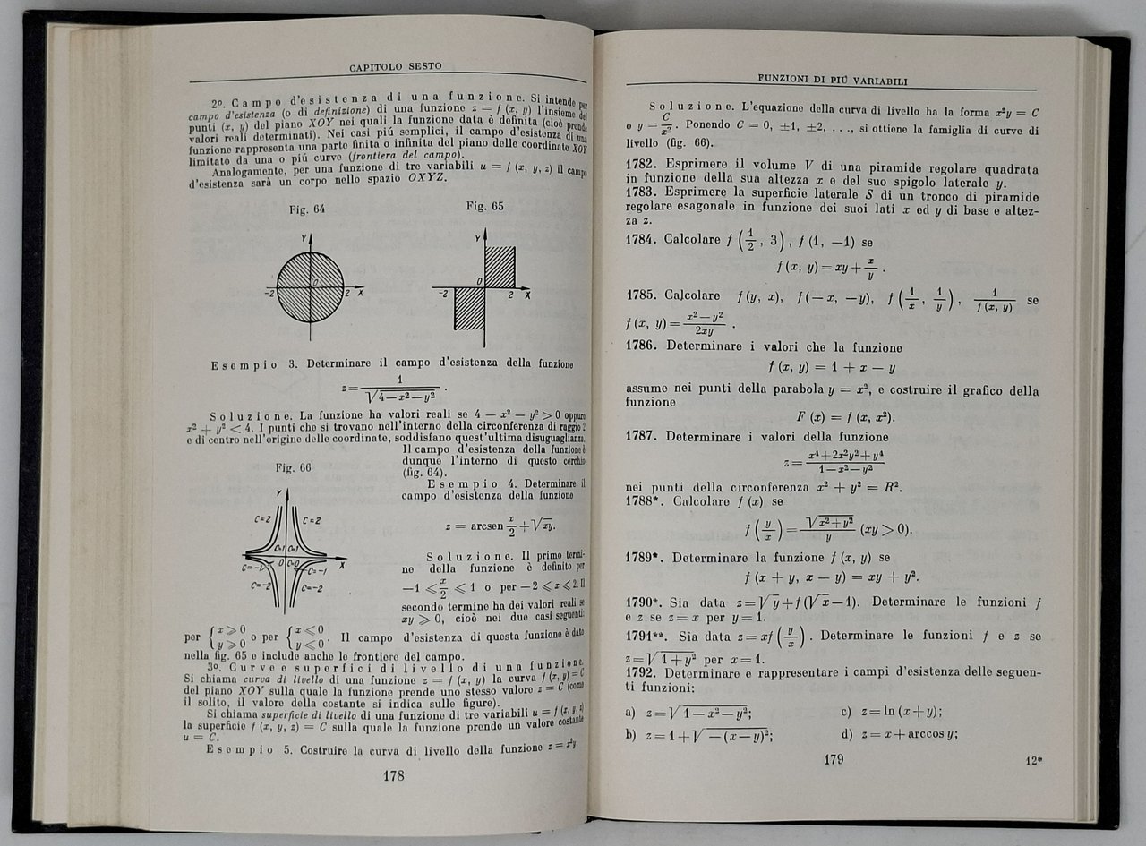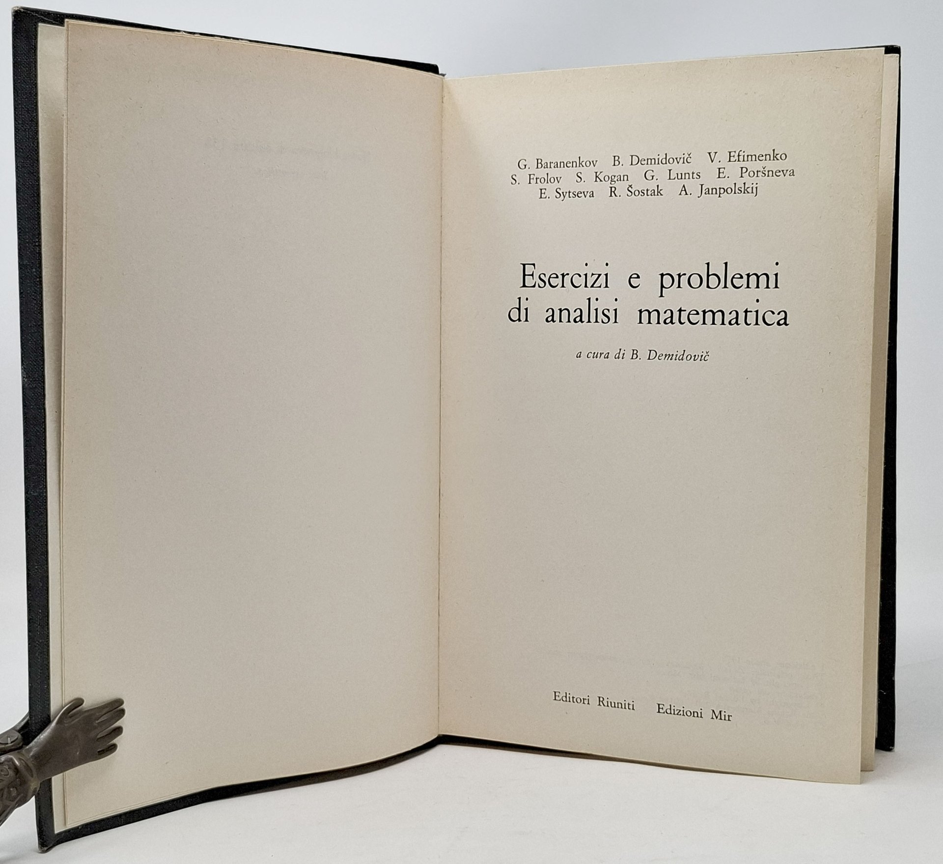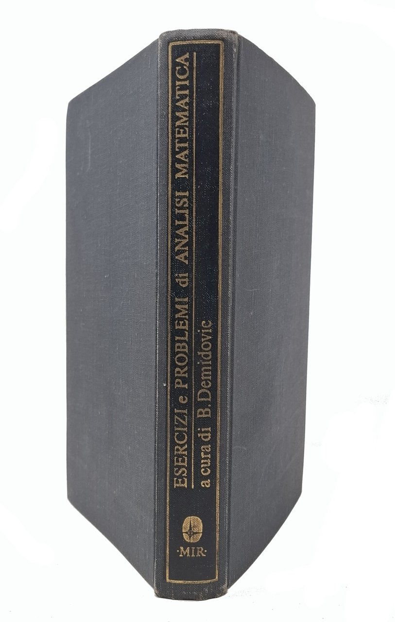 Autori: G. Baranenkov, B. Demidovic, V. Efimenko, S. Frolov, S. Kogan, G. Lunts, E. Porsneva, E. Sytseva, R. Sostak, A. Janpolskij. A cura di B. Demidovic. I edizione: aprile 1975. Collana: Nuova biblioteca di cultura 138 / Serie scientifica. Pagine: 486. Formato: 14,5 x 22 cm circa. Stato di conservazione: è stato asportato il foglio (presumibilmente bianco) tra il frontespizio e la prima pagina dell'indice, sporadici segni per lo più a matita, per indicare gli esercizi svolti e una formula scritta a pastello blu ma, nel complesso, un buon esemplare. Manca della Sovraccoperta.Copertina editoriale cartonata rigida con titolo incorniciato in oro sul dorso. Indice dei grandi capitoli: I- Introduzione all'analisi, II- Derivazione delle funzioni, III- Estremi delle funzioni ed applicazioni geometriche della derivata, IV- Integrale indefinito, V- Integrale definito, VI- Funzioni di più variabili, VII- Integrali multipli ed integrali curvilinei, VIII- Serie, IX- Equazioni differenziali, X- Calcolo approssimato; Risposte, Appendici.