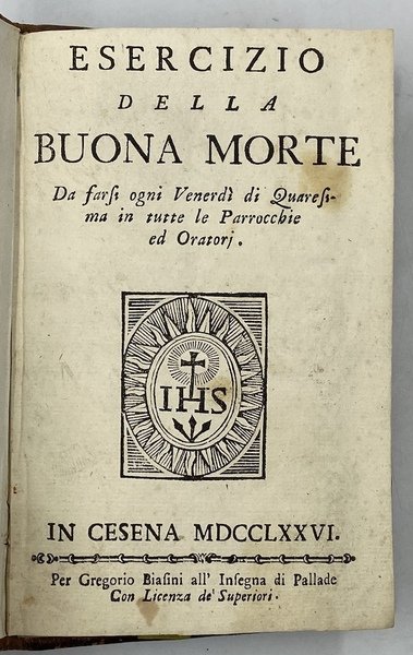 ESERCIZIO DELLA BUONA MORTE. Da farsi ogni Venerdì di Quaresima in tutte le Parrocchie ed Oratori. IN CESENA MDCCLXXVI. Per Gregorio Biasini all’Insegna di Pallade. [legato con] Brevi Divote Considerazioni PREGHIERE ED ORAZIONI Con le quali può ogn’Anima fedele prepararsi alla venuta DELLO SPIRITO SANTO Ed impetrare i suoi doni. Raccolte, e date in luce a beneficio di tutti dalle MM. RR. Madri dello Spirito Santo di Cesena In occasione di celebrare con Religiosa pompa l’anniversaria Festa nelli tre giorni di Pentecoste E DALLE MEDESIME Dedicate i segno di profondissimo ossequio al merito sublime Dell’Ill.mo e Rev.mo Monsignore FRANCESCO DE’ CONTI AGUSELLI. IN CESENA 1777. Per LUDOVICO GENESTRI.