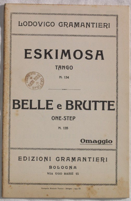 In 8. cm 27x17,5. pp. 30. partitura completa per orchestra del 1933 di due canzoni. Caratteristica copertina illustrata. Ex libris sulla copertina ed in qualche pagina. Ottime condizioni. a complete score for orchestra of 1933. Carachteristic decorated cover of that period. Ex libris in the cover and in some pages. Very good conditions.