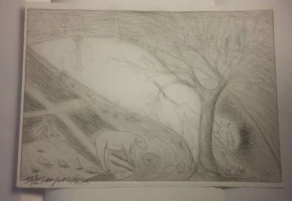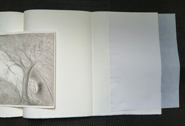 cofanetto cartonato formato 36X25,5 contenente un volume in brossura con sovraccoperta piegata a busta. Pagine 46 + una piegata contenente una acquaforte numerata e firmata da Paladino. Tiratura in 150 esemplari numerati e firmati su carta Hahnemule (103). Copia in perfetto stato di conservazione