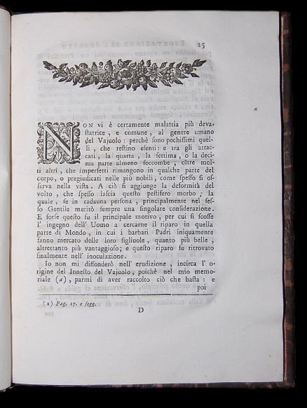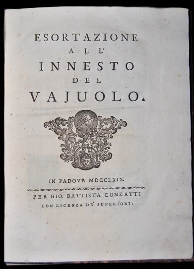 In 4° (24×17,5 cm); 122 pp. Bella legatura coeva in piena pelle marmorizzata con dorso a 4 nervi e titolo e ricchi fregi in oro ai tasselli, cornice con doppio filetto a secco ai piatti. Tagli spruzzati in rosso. Xilografia al frontespizio. Iniziali xilografiche. Due pagine con leggerissima brunitura e per il resto esemplare in buone-ottime condizioni di conservazione. Prima rara edizione, due soli esemplari censiti in ICCU, di questo importante scritto del noto medico originario di Perarolo (Belluno), Giovanni della Bona (anche Dalla Bona o Bona; Perarolo, 8 settembre 1712 Padova, 28 dicembre 1786). Nel 1768 presentava ai Riformatori delluniversità di Padova, affinché fosse trasmesso al magistrato della Sanità, un memoriale in cui chiedeva lincarico di dirigere per la città la pratica della vaccinazione antivaiolosa. Ottenutolo, pubblicava nel 1769 a Padova lEsortazione allinnesto del vaiolo, opera indirizzata ai sopraprovveditori e provveditori alla Sanità di Venezia, affinché la pubblica autorità lo aiutasse a diffondere luso della vaccinazione antivaiolosa. Lopera tendeva a sottolineare il carattere permanentemente immunizzante della metodica e la sua totale mancanza di complicazioni letali.. Lautore Fu avviato alla vita ecclesiastica e, sotto la guida del parroco del suo paese, venne indirizzato verso gli ordini minori. Si trasferì poi a Padova per attendere agli studi superiori ma, dopo la morte del padre, abbandonò il chiericato per dedicarsi agli studi medici. Frequentò quindi luniversità di Padova (e in particolare le lezioni di Alessandro Knips Macoppe), uscendone laureato nel 1735. Fu tirocinante per ben dodici anni, quindi si stabilì nel Veronese per esercitare la professione. Vi trascorse nove anni di intensa attività, dai quali scaturirono il suo primo studio: Luso e labuso del caffè. Dissertazione storico-fisico-medica, pubblicato nel 1751 e poi riedito nel 1760 con aggiunte massime intorno la cioccolata ed i rosoli. Si tratta di unopera per alcuni versi interessante, in quanto vi venivano formulate conclusioni ancor oggi valide; daltro canto, nel complesso non emergeva nel panorama della letteratura medica in quanto si trattava, di fatto, unesercitazione accademica. Nel 1754 diede alle stampe la Dissertazione teorico-pratica dellutilità del salasso nel vaiuolo nella quale confutava la teoria secondo la quale il salasso avrebbe impedito linsorgere di eruzioni cutanee nel vaiolo. Del 1757 è lHistoria aliquot curationum mercurio sublimato corrodenti perfectarum, in cui riportava i risultati della somministrazione di preparati a base di bicloruro di mercurio come antiluetici. In questo lavoro il Della Bona sottolineava come le cure dovevano essere adeguate alla costituzione, al temperamento e alla sensibilità del paziente e attaccava quei medici che somministravano medicinali senza le dovute accortezze. In questo periodo andò gradualmente ad acquisire una certa fama e finalmente, nel 1764, fu chiamato a coprire la cattedra della facoltà di medicina dellateneo patavino, rimasta vacante dopo la morte di Knips Macoppe. Lincarico comprendeva anche la direzione del reparto di medicina pratica presso lospedale della città. Nello stesso periodo continuò a redigere nuove pubblicazioni: nel 1765 usciva la seconda edizione del Tractatus de scorbuto (già pubblicato nel 1761) e nel 1766 venivano stampate le Observationes medicae ad praxim in nosocomio ostendendam anno 1765, praemissa oratione prima in gymnasio habita. Importanti furono i suoi contributi alla terapia china-china, con i quali confutò lo scetticismo dellopinione comune e anche degli stessi medici e rivalutò tecniche cadute in disuso. Le sue tesi assunsero maggior credito quando curo alcuni pazienti illustri quali Guglielmo Enrico di Hannover e il generale Spaar. Nel 1768 ottenne dal magistrato alla Sanità di dirigere il programma di vaccinazione antivaiolosa per la città di Padova. Lanno successivo pubblicò lEsortazione allinnesto del vaiolo, indirizzata ai componenti della stessa magistratura perché lo aiutassero a diffondere luso della vaccinazione. Di carattere ruvido e assai caparbio, continuò la sua attività anche in età avanzata, nonostante nel 1784 fosse stato vittima di un colpo apoplettico. Morì in seguito a un secondo attacco dello stesso male.. Esemplare in buone-ottime condizioni di conservazione. Cfr.: Blake 107; Wellcome II, 197; vgl. Hirsch/Hübotter II, 214.